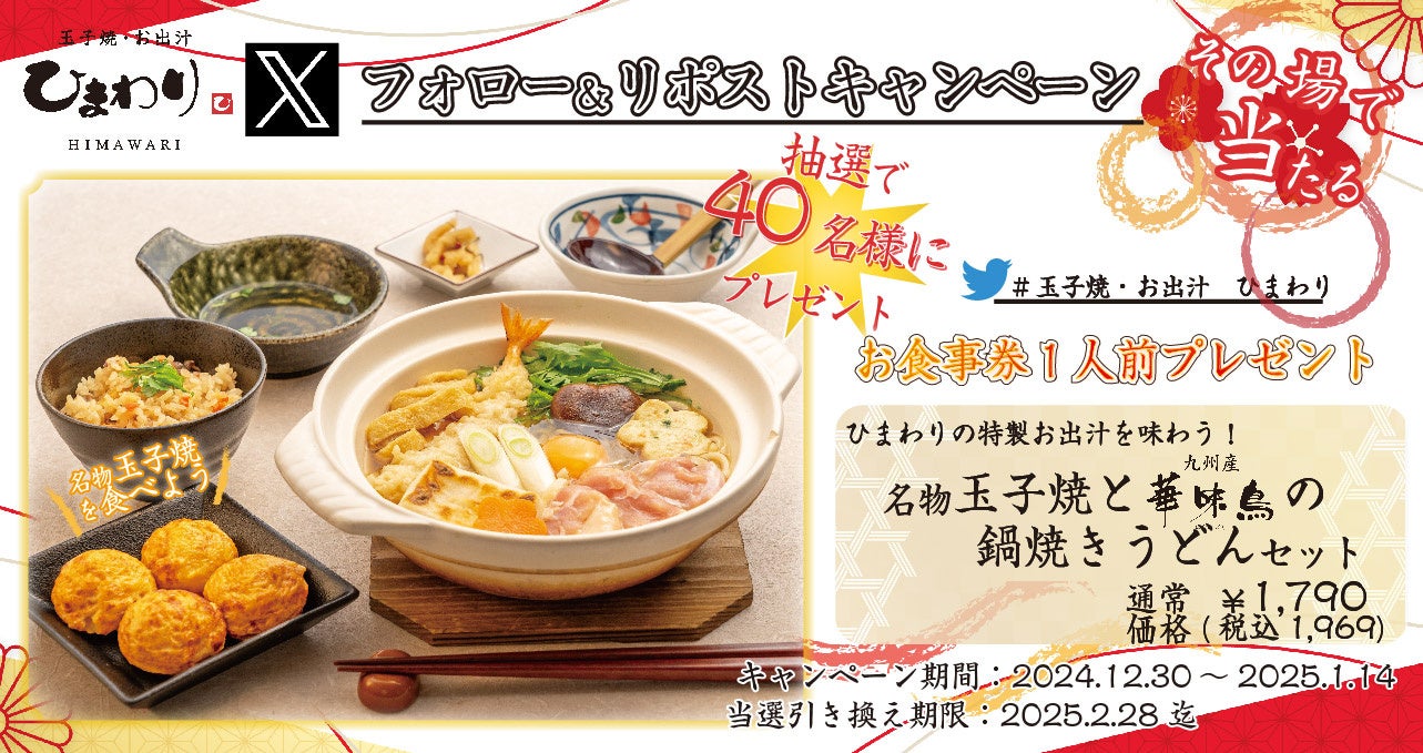 この度、玉子焼・お出汁ひまわり公式Xアカウントとフォロー&リポストして応募すると、抽選で40名様に「名物玉子焼と華味鳥の鍋焼きうどんセット1人前(税込み1,969円)」をお召し上がりいただけるデジタルお食事券プレゼントキャンペーンを2024年12月30日(月)より開催します。この機会にぜひご応募ください。