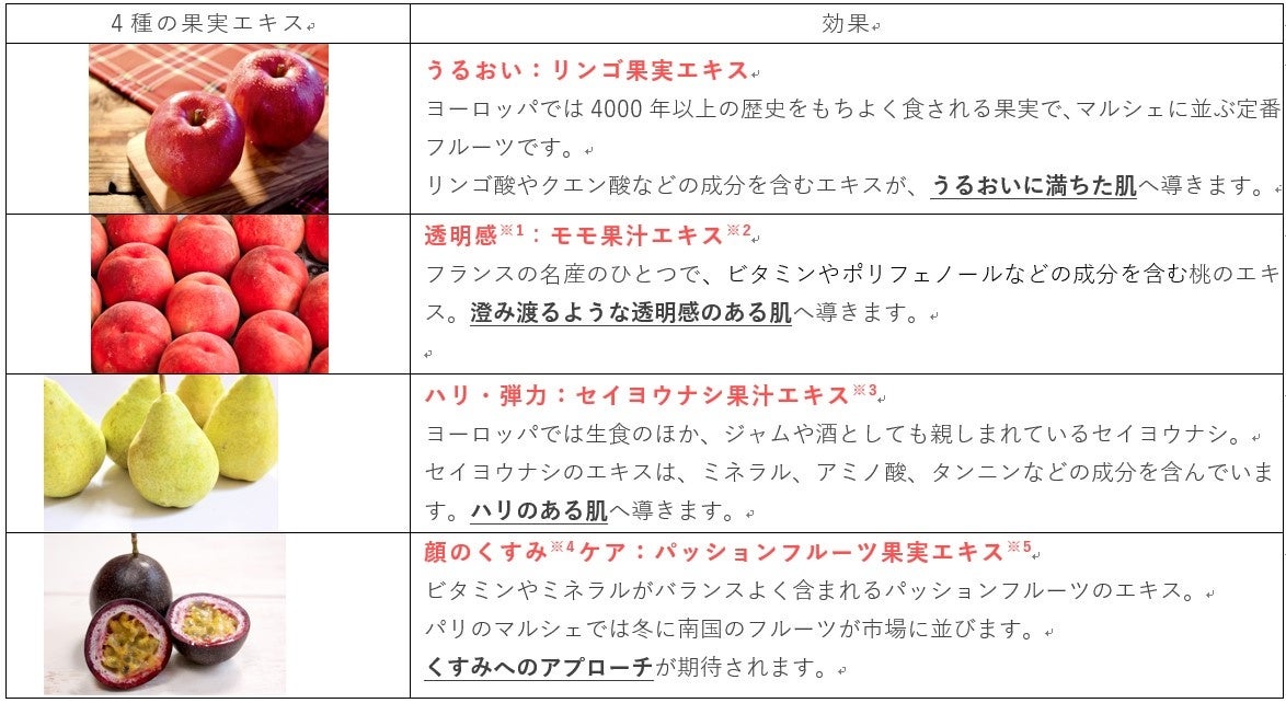 - 【NEW】1.マルシェに並ぶフレッシュな果実をテーマに、冬肌に嬉しい4種の果実エキスを配合