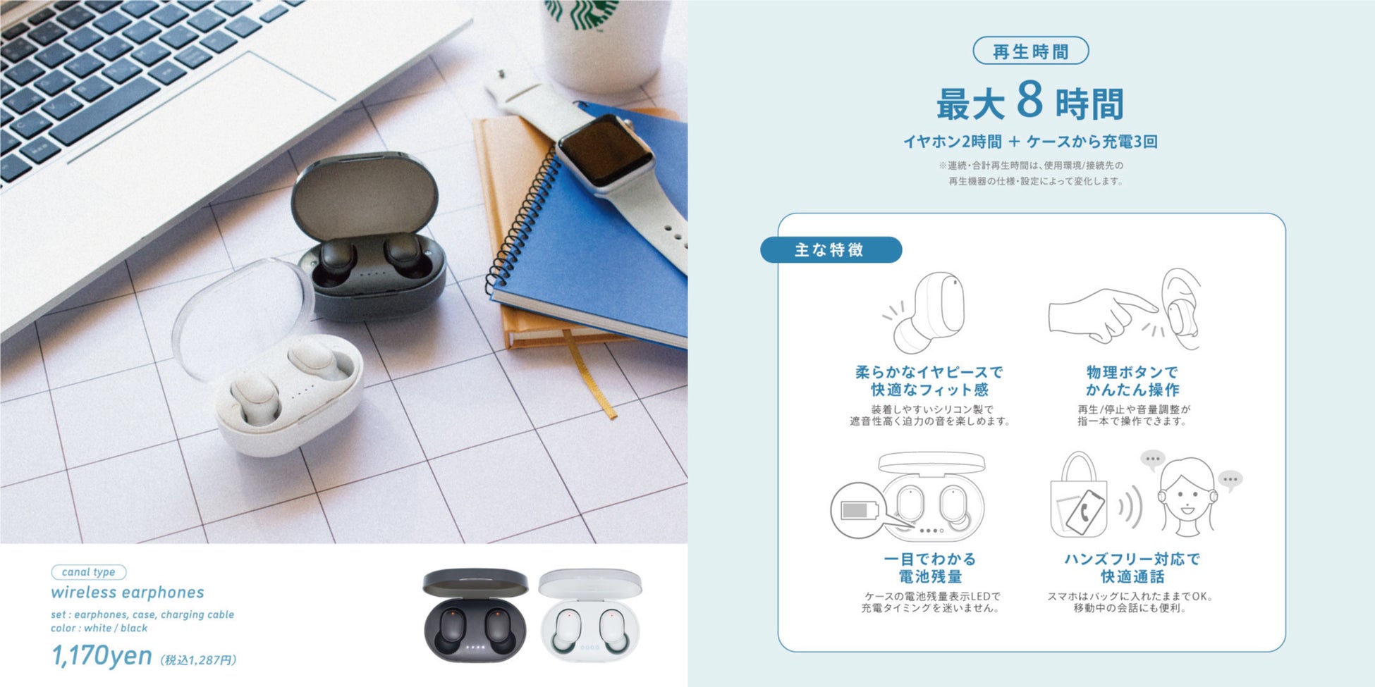 "背伸びしなくても手に入る、日常使いのおしゃれなデジタルデバイス"「THANK YOU DEVICE」シリーズから新商品の「カナル型ワイヤレスイヤホン」を、8月下旬より全国のサンキューマートで入荷順次販売を開始いたします。カナル型イヤピースでフィット感と音質が増し、税抜1,170円(税込1,287円)でクリアな音を楽しめるスタイリッシュなデザインのワイヤレスイヤホンです。