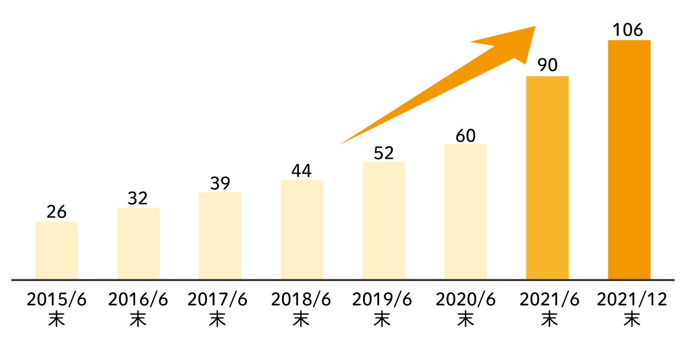 2020年は新型コロナウイルス拡大による緊急事態宣言発令などがありましたが、2020年から2021年にかけての1年で対前年比1.5倍まで店舗数を拡大しました。その勢いは衰えることなく100店舗目に到達いたしました。