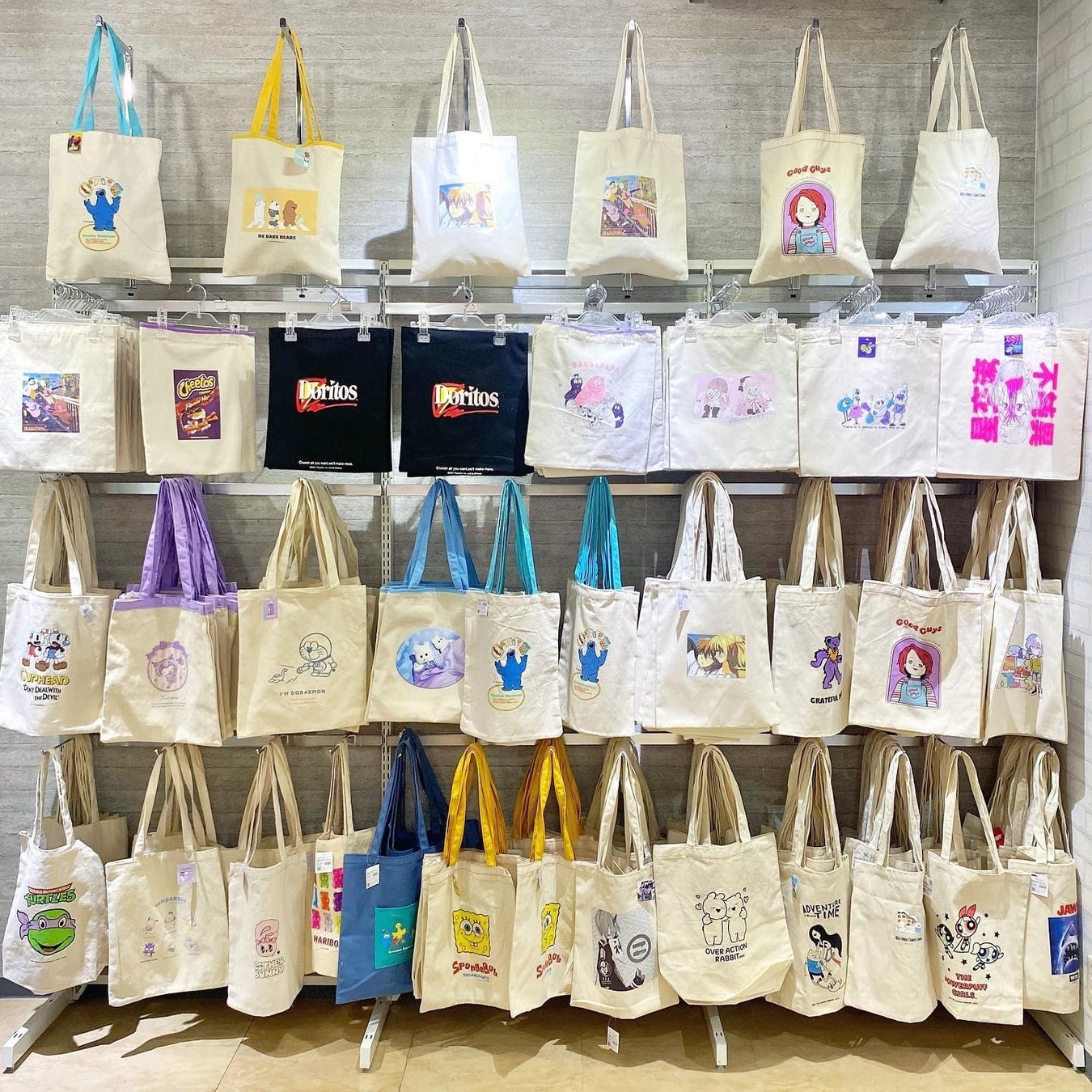 人気のキャラクターやアニメ・映画作品、イラストレーター等多岐にわるライセンスとのコラボ商品を展開。トレンドを取り入れたオリジナルデザイン等合わせると合計100種類以上のアイテムを展開しています。エコバッグとして使いたくても値が張りがちで中々手が出しづらいトートバッグですがサンキューマートなら全て390円(税込429円)のため、複数買いされる方が多い商品です。