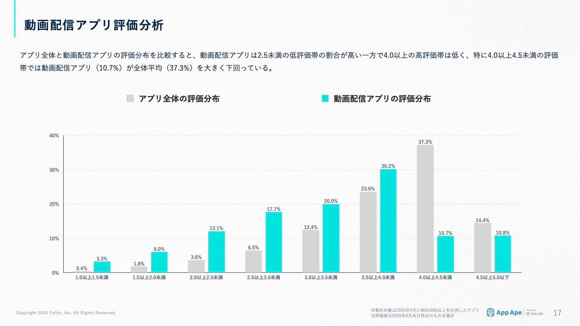 アプリ全体と動画配信アプリの評価分布を比較すると、動画配信アプリは2.5未満の低評価帯の割合が高い一方で4.0以上の高評価帯は低く、特に4.0以上4.5未満の評価帯では動画配信アプリ(10.7%)が全体平均(37.3%)を大きく下回りました。