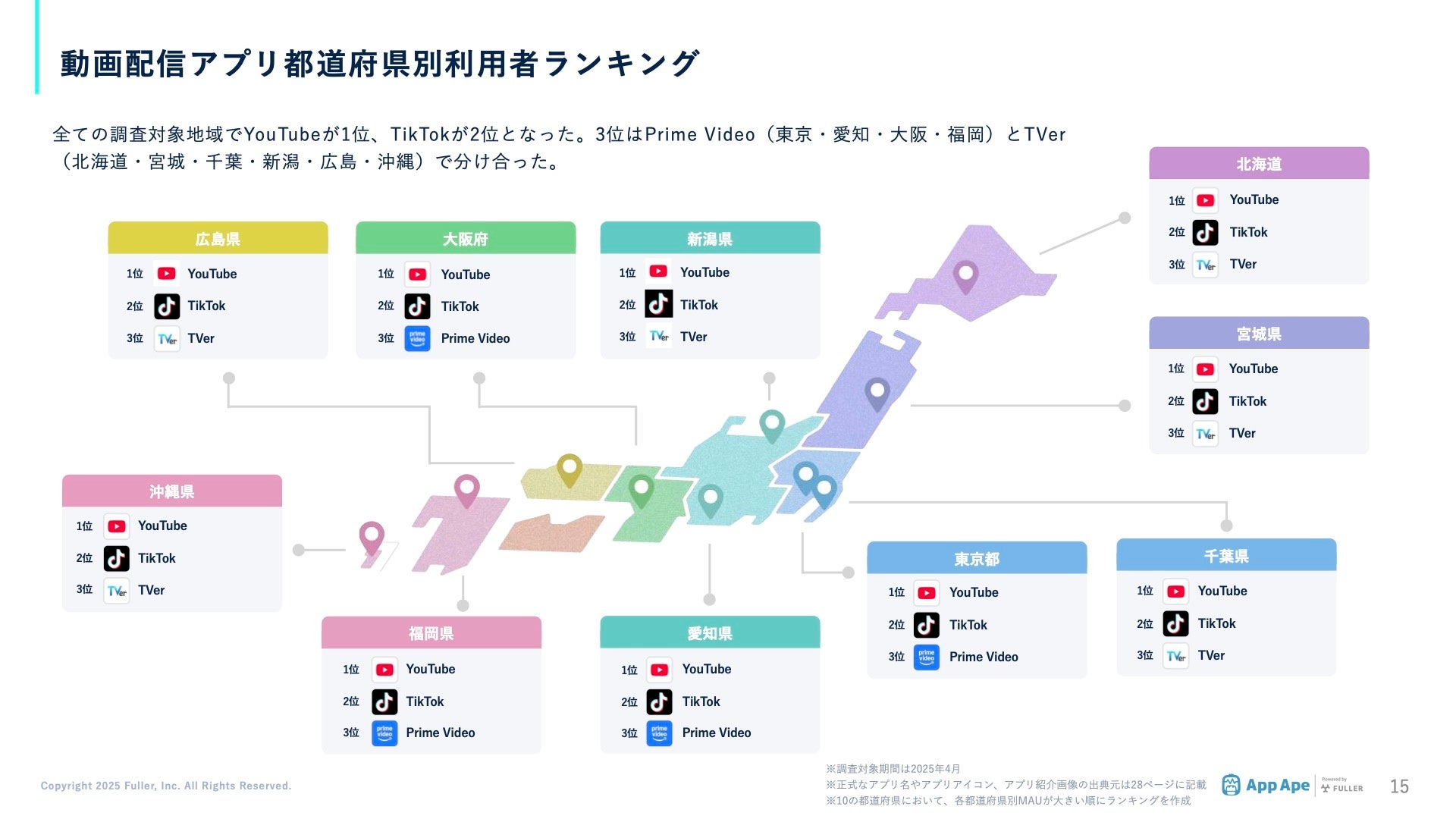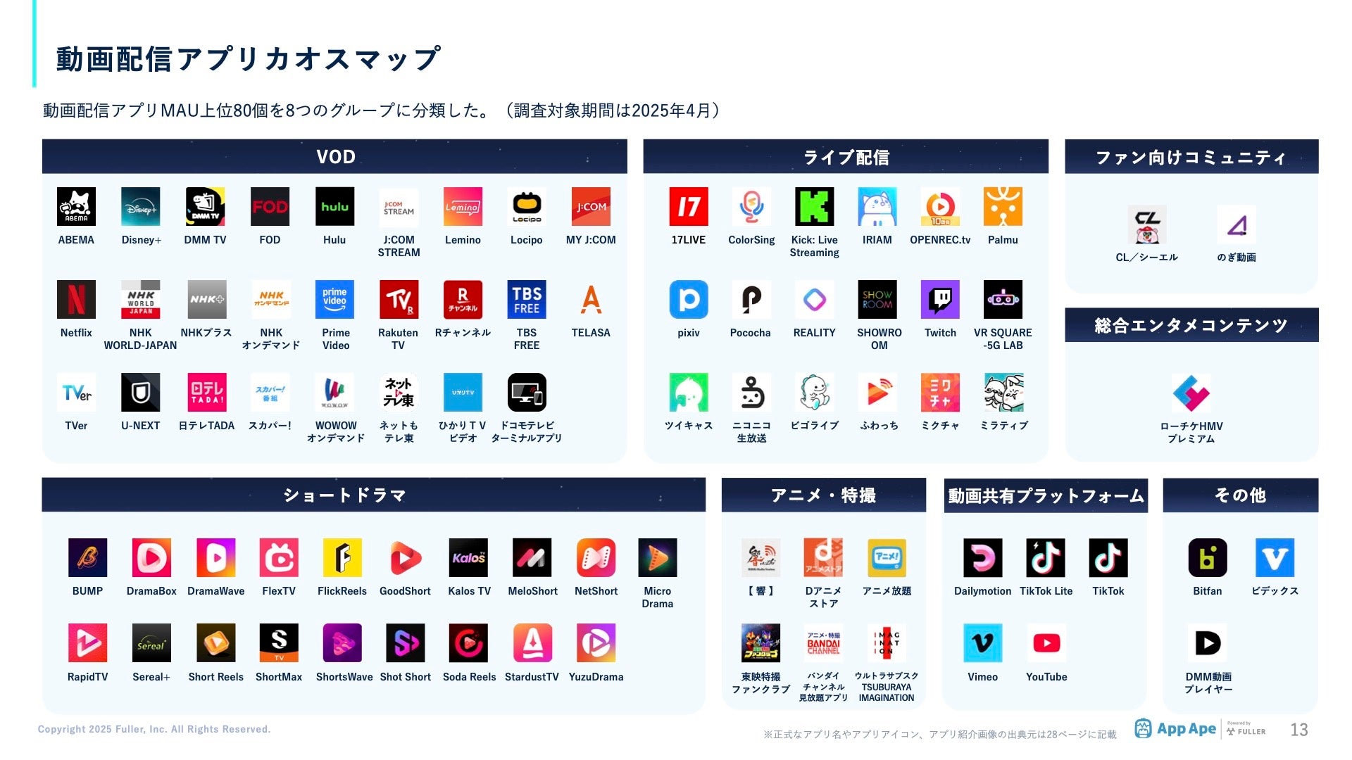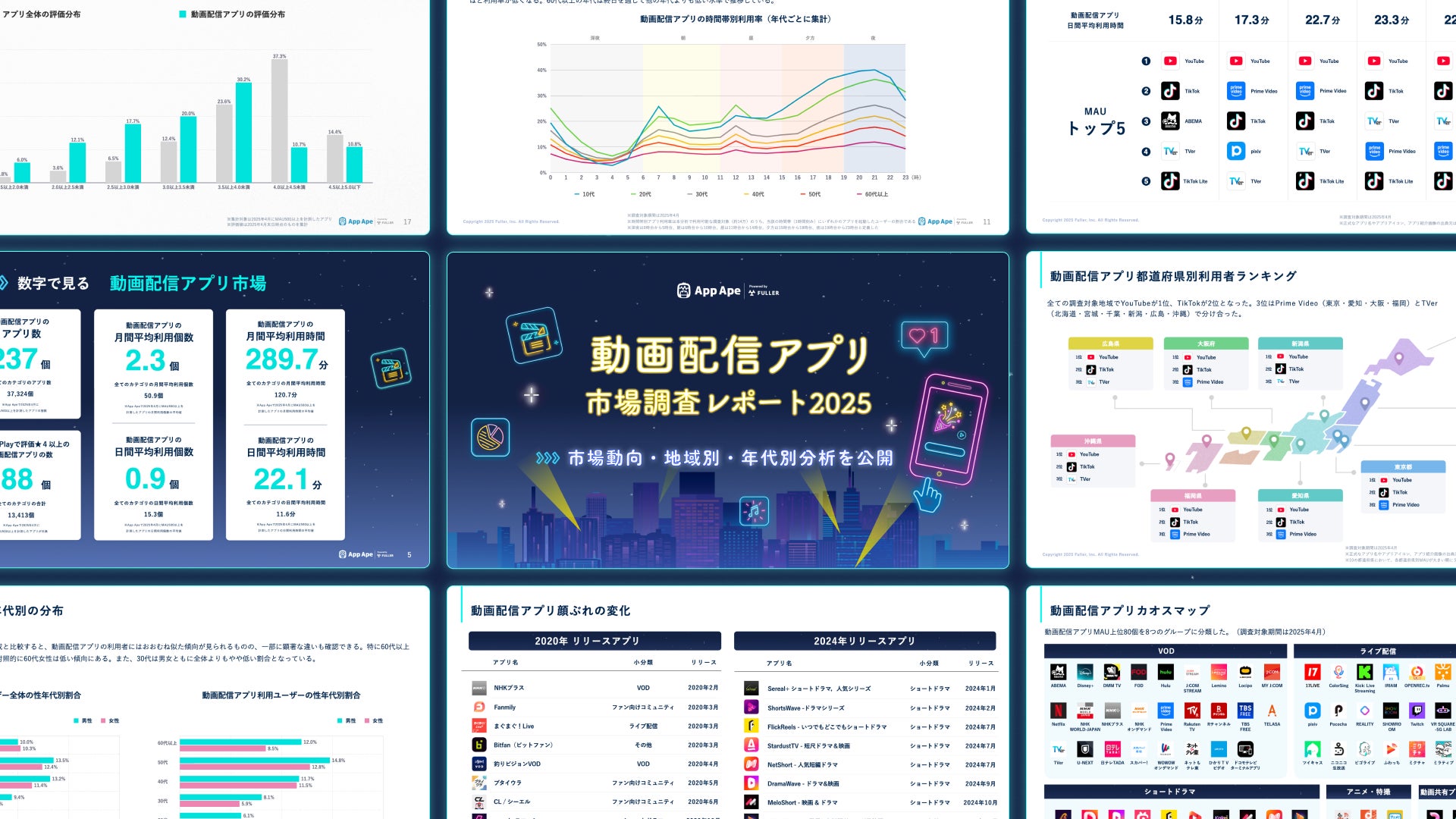 フラー株式会社(本社:新潟県新潟市、代表取締役社長:山﨑将司、以下「フラー」)は、アプリ市場分析サービス「App Ape(アップ・エイプ)」で蓄積するデータをもとに、動画配信アプリの動向や特徴をまとめた「動画配信アプリ市場調査レポート2025」を公開しました。