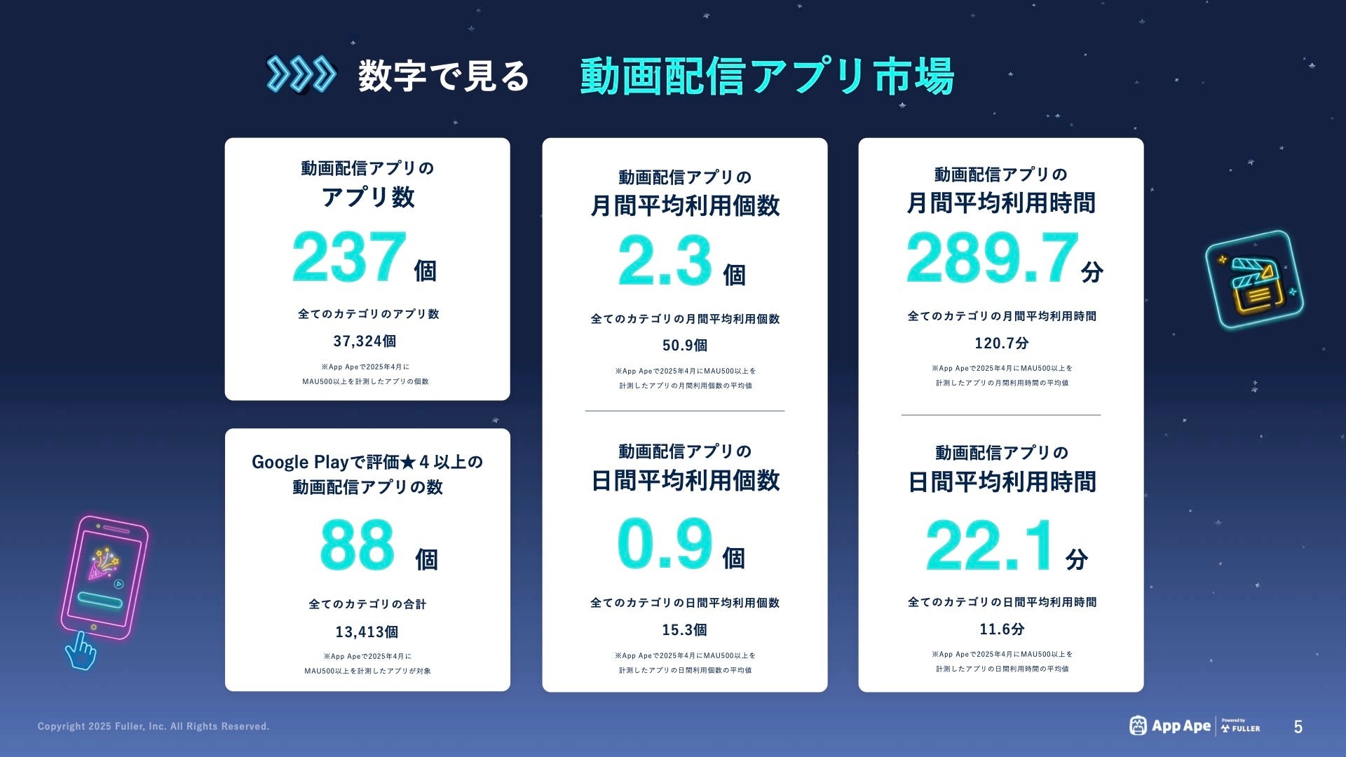 2025年4月時点で、MAU500以上の動画配信アプリは237個、全アプリのうち約0.6%に相当します。