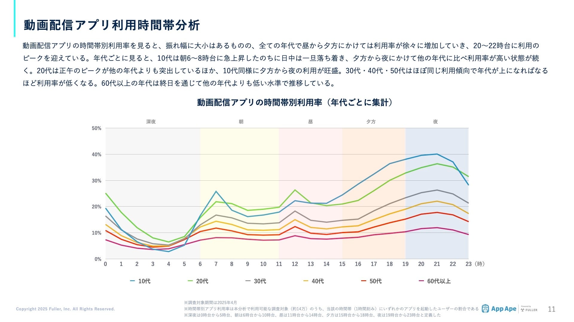 動画配信アプリの利用は全世代で20〜22時にピークを迎える傾向があり、10代は朝にも利用が活発化しています。20代は昼と夜の利用が目立ち、30〜50代は似た傾向を示すものの年齢が上がるほど利用率は低下。60代以上は終日を通して利用率が低い水準にとどまりました。