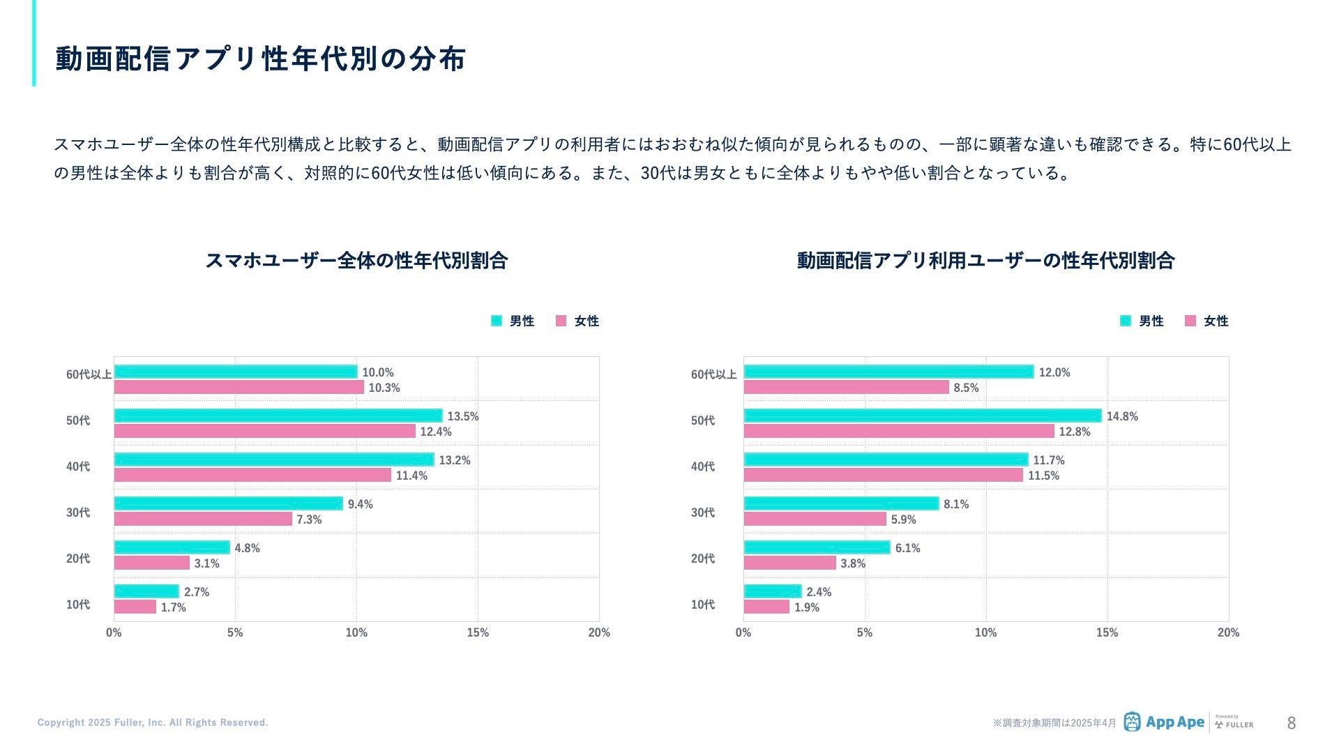 スマホユーザー全体の性年代別構成と比較すると、動画配信アプリの利用者にはおおむね似た傾向が見られるものの、一部に顕著な違いも確認できます。特に60代以上の男性は全体よりも割合が高く、対照的に60代女性は低い傾向にあります。また、30代は男女ともに全体よりもやや低い割合となっています。