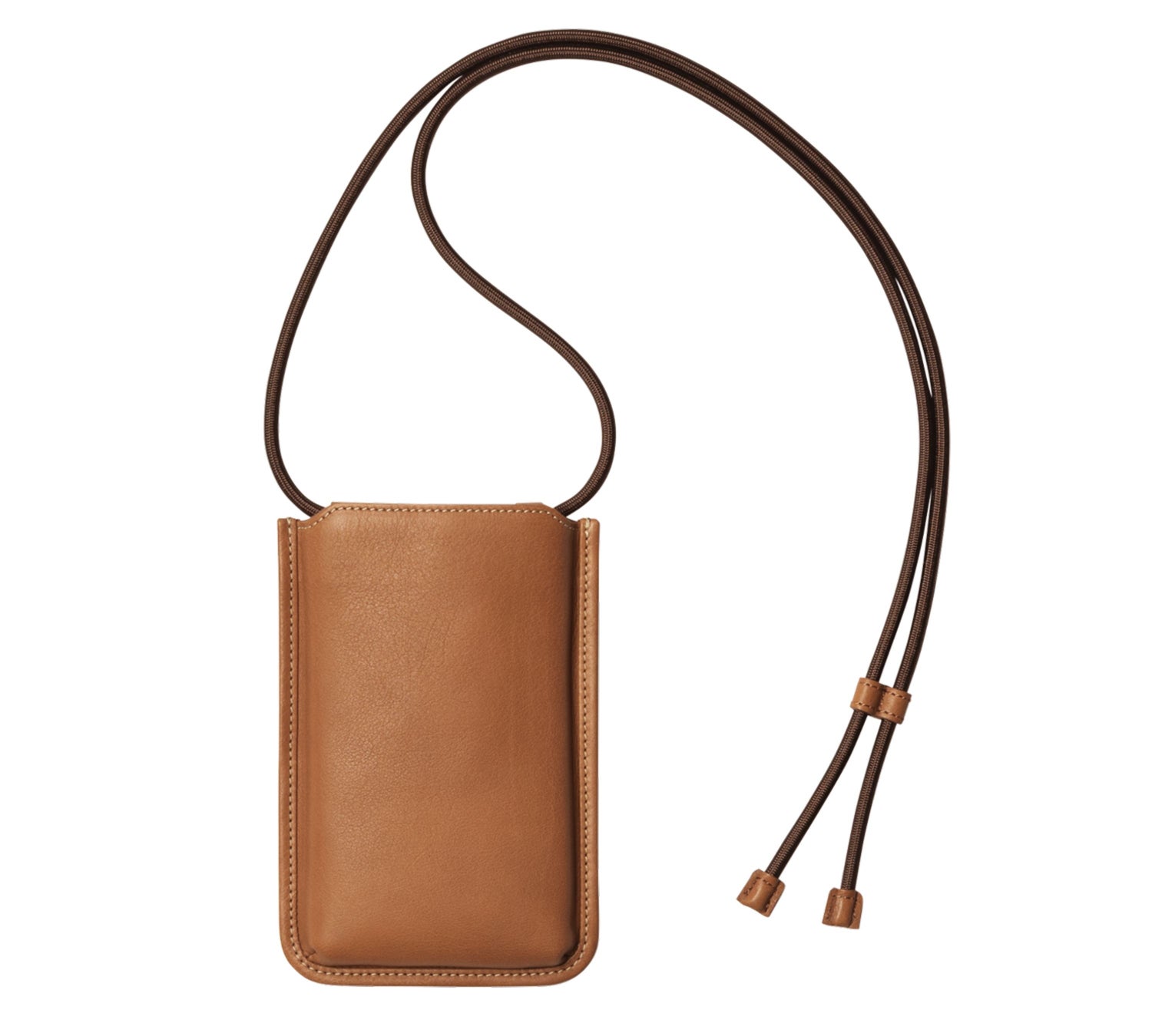 「レザースマホショルダー」には、紐にブラウン色を、ステッチに生成りをあしらい、同じ革ならではの素材感を引き立てる、落ち着いたカラーバランスとしています。