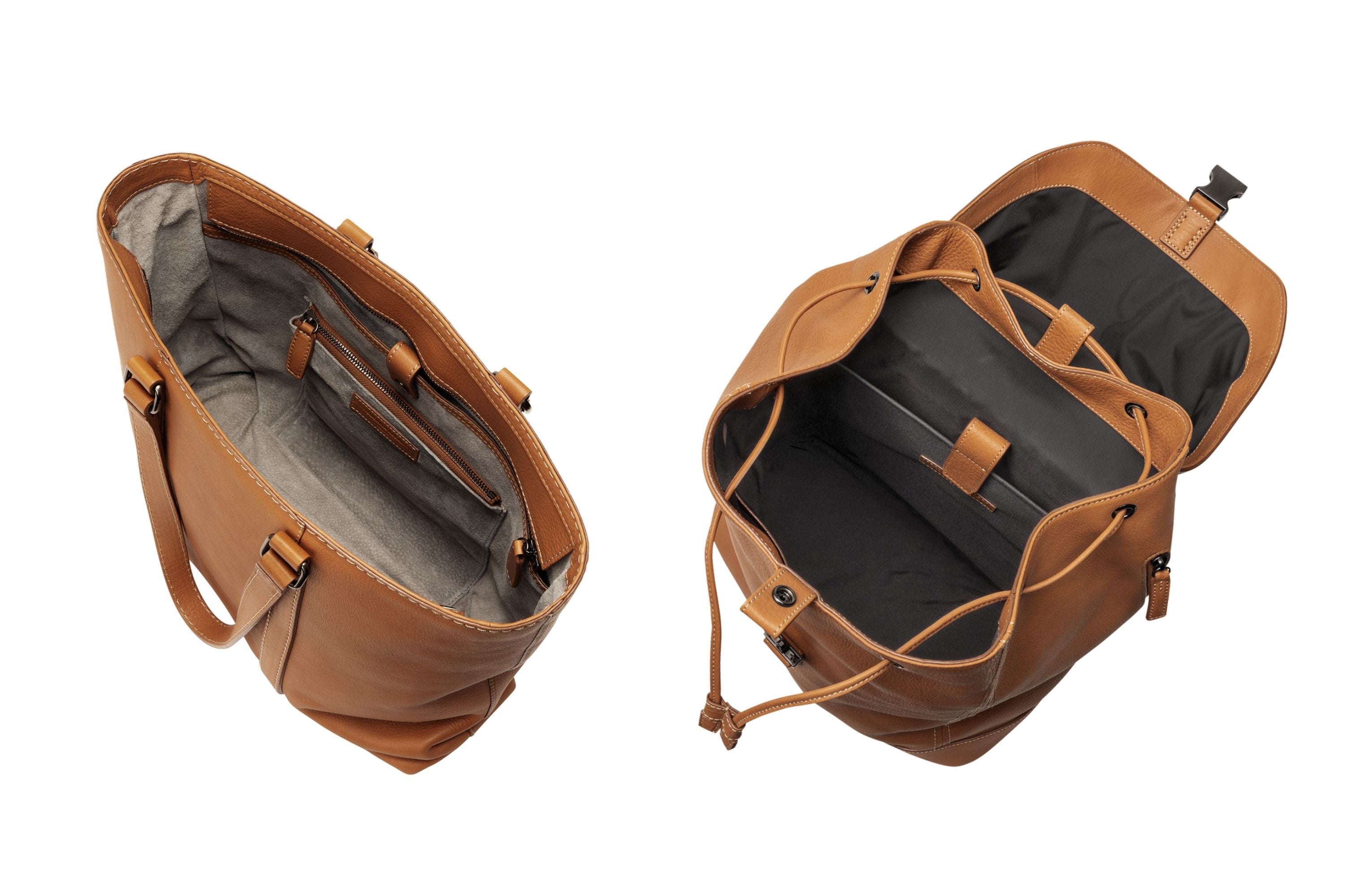 内装カラーは、ピッグスエード内装のモデルにはスモークベージュを、ナイロン内装のモデルにはブラックを採用しています。背当てのカラーは、ソフト牛革仕様にはブラウン、ナイロン仕様にはブラックをそれぞれ使用しました。ステッチカラーは生成りで統一し、金具にはシックなブラックシルバーを採用。柔らかく自然な「タン」の革色と組み合わせることで、全体にモダンで落ち着いた印象を与えています。