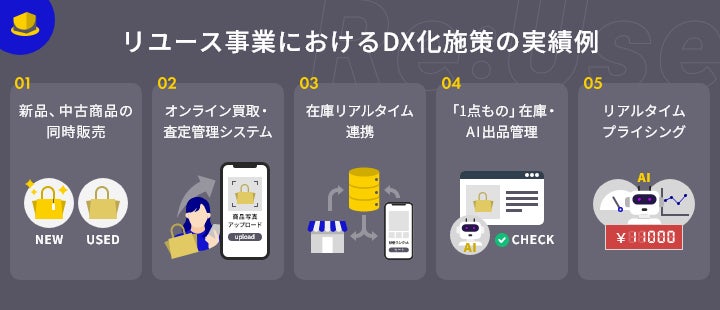 本サービスは、単なるECサイト構築ではなく、IT技術を活用して業務効率化やノウハウ継承による人手不足の解消、利益率の向上、顧客の利便性向上等、リユース事業を変革(DX)するためのソリューションです。