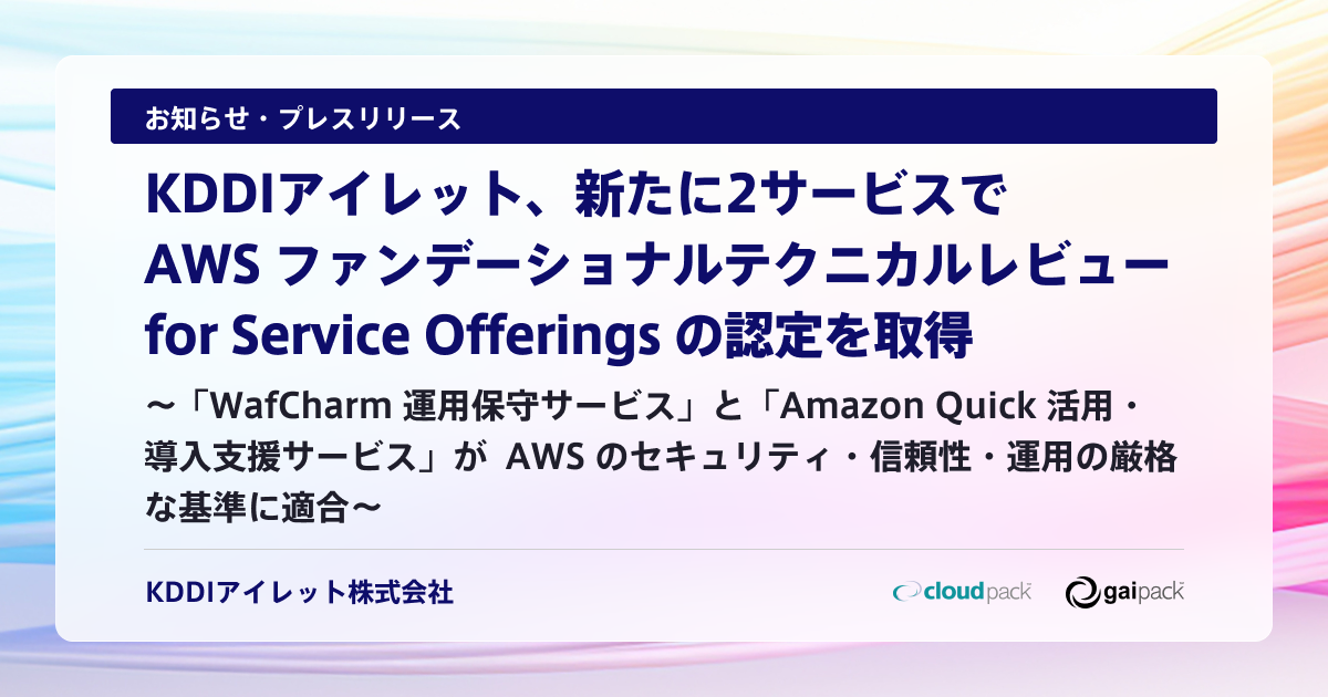 クラウド・マルチクラウド導入実績と最先端 AI 技術を統合し、AI の社会実装を加速する AI インテグレーターである KDDIアイレット株式会社(本社:東京都港区、代表取締役社長:髙木 秀悟、以下 KDDIアイレット)は、アマゾン ウェブ サービス(以下、AWS)のパートナープログラムである AWS ファンデーショナルテクニカルレビュー for Service Offerings(以下、AWS FTR)の認定を、「WafCharm 運用保守サービス」および「Amazon Quick 活用・導入支援サービス」の2サービスにて新たに取得したことをお知らせします。本認定の取得により、両サービスが AWS のセキュリティ、信頼性、優れた運用に関する厳格な基準に準拠していることが証明されました。