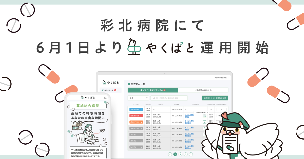 医療機関起点の薬局予約サービス「やくばと」医療法人福島会が運営する彩北病院にて6月1日より運用開始