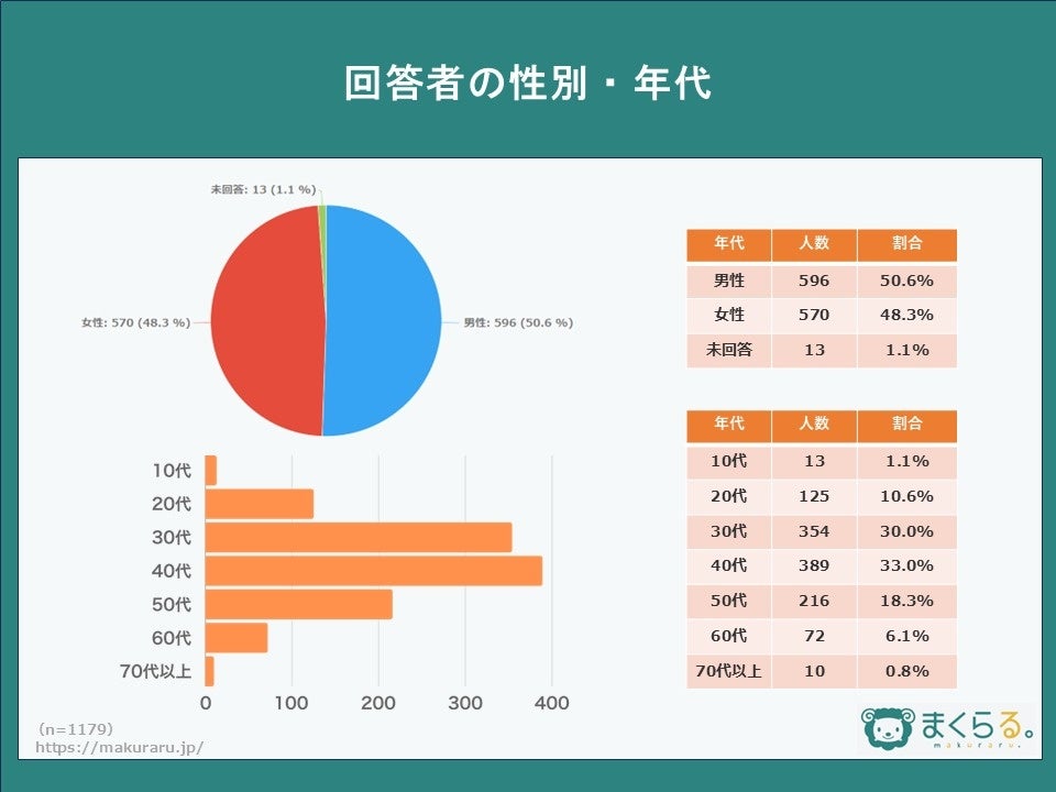 オーダーメイド枕の情報メディア「まくらる」がアンケート調査結果を公開。10代~70代以上の男女(計1,179名)を対象に調査。