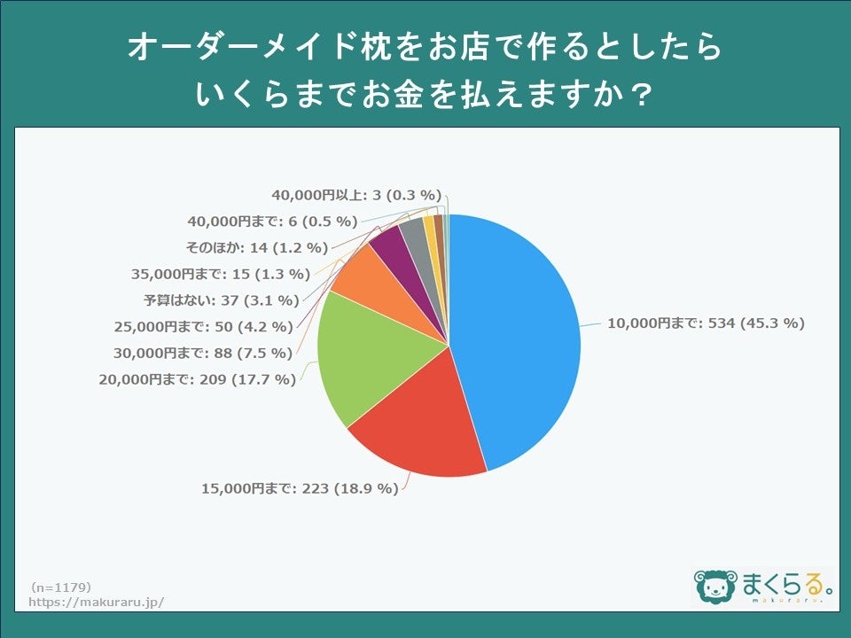 オーダーメイド枕の購入予算は「10,000円まで」が 45.3% と最多。一方、実際の平均販売価格はおおよそ25,000円と大きく乖離。オーダーメイド枕の普及に課題。「まくらる」調べ。