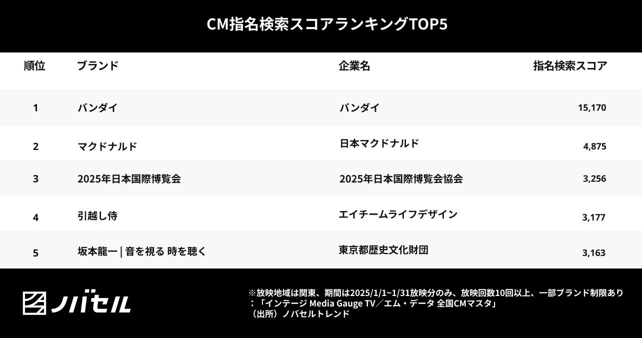 ソフトウェアとプロフェッショナル人材の力でマーケティングの民主化を目指すノバセル株式会社(本社:東京都港区、代表取締役社長:田部正樹、以下ノバセル)は、テレビCM効果の分析サービス「ノバセル トレンド」を活用し、2025年1月に放映されたテレビCMの指名検索スコアランキングを発表いたします。