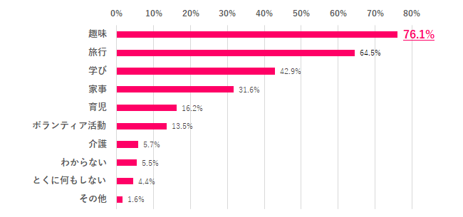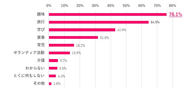 仕事を辞めたら、仕事をしていた時間を何に費やす予定か、については、1位「趣味」76.1%、2位「旅行」64.5%、3位「学び」42.9%となりました。「わからない」と答えた人は5.5%しかおらず、やりたいことがある人が多いようです。
