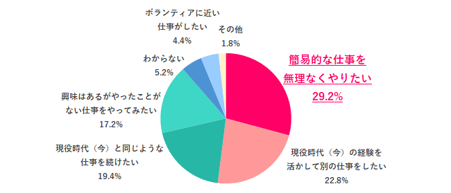 Q.1で60歳以上の年齢を回答した人に、60歳以降はどんな仕事がしたいか尋ねると、1位「簡易的な仕事を無理なくやりたい」29.2%、2位「現役時代(今)の経験を活かして別の仕事をしたい」22.8%、3位「現役時代(今)と同じような仕事を続けたい」19.4%となりました。