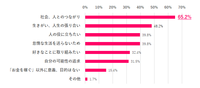 「お金を稼ぐ」以外で、働く意義、目的は何かと尋ねると、1位「社会、人とのつながり」65.2%、2位「生きがい、人生の張り合い」48.2%、3位「人の役に立ちたい」と「怠惰な生活を送らないため」が同率で39.8%でした。「お金を稼ぐ以外に意義、目的はない」を選択した人は15.4%で、多くの人がお金以外の価値も感じているようです。