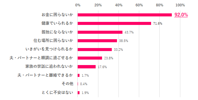 老後にどのような不安があるかについては、1位「お金に困らないか」92.0%、2位「健康でいられるか」71.6%、3位「孤独にならないか」43.7%でした。「とくに不安はない」と答えた人は1.9%しかおらず、やはりお金や健康の不安は大きいようです。