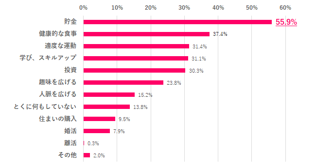 Q.7で回答した不安を解消するために、今からしていることを尋ねると、1位「貯金」55.9%、2位「健康的な食事」37.4%、3位「適度な運動」31.4%となりました。「とくに何もしていない」人は13.8%でした。