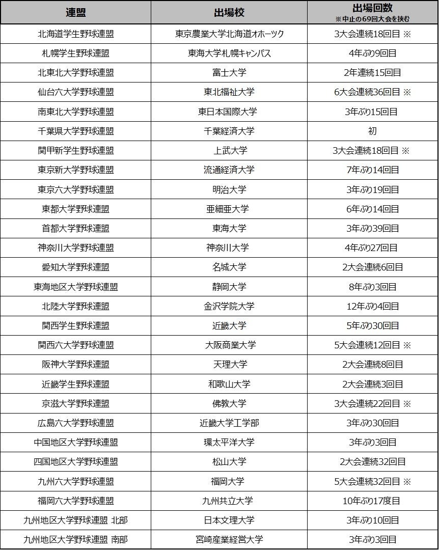 大学野球界で最高位のタイトルとなる「全日本大学野球選手権」が、今年も明治神宮球場と東京ドームを舞台に、6月6日(月)から12日(日)まで7日間に渡って開催されます。昨年の第70回記念大会では、慶應義塾大学が34年ぶり4回目の優勝を飾りました。今年は初出場の千葉経済大学(千葉県大学野球連盟)、6年ぶり14回目・亜細亜大学(東都大学野球連盟)、12年ぶり4回目・金沢学院大学(北陸大学野球連盟)、2019年大会優勝・明治大学(東京六大学野球連盟)など、初出場から常連校まで全国26大学野球連盟の春季リーグ戦を勝ち抜いた27の代表校が大学日本一の座をかけて熱い戦いを繰り広げます。