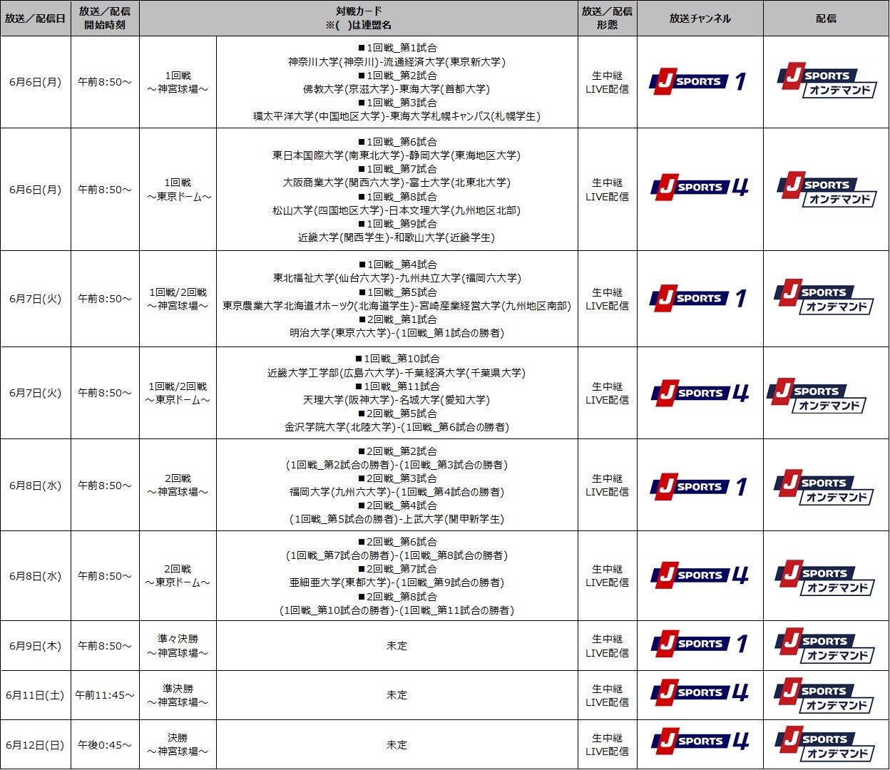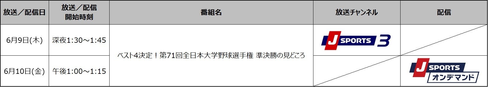 国内最大4チャンネルのスポーツテレビ局、株式会社ジェイ・スポーツ(本社 東京都江東区、代表取締役社長 長谷一郎、以下「J SPORTS」 ※1)は、6月6日(月)に開幕する「第71回 全日本大学野球選手権大会」を試合開始から試合終了まで全試合生中継いたします。また、 PC、スマホ、タブレットで見られる動画配信サービス 「J SPORTSオンデマンド」※2でも全試合LIVE配信でお届けいたします。