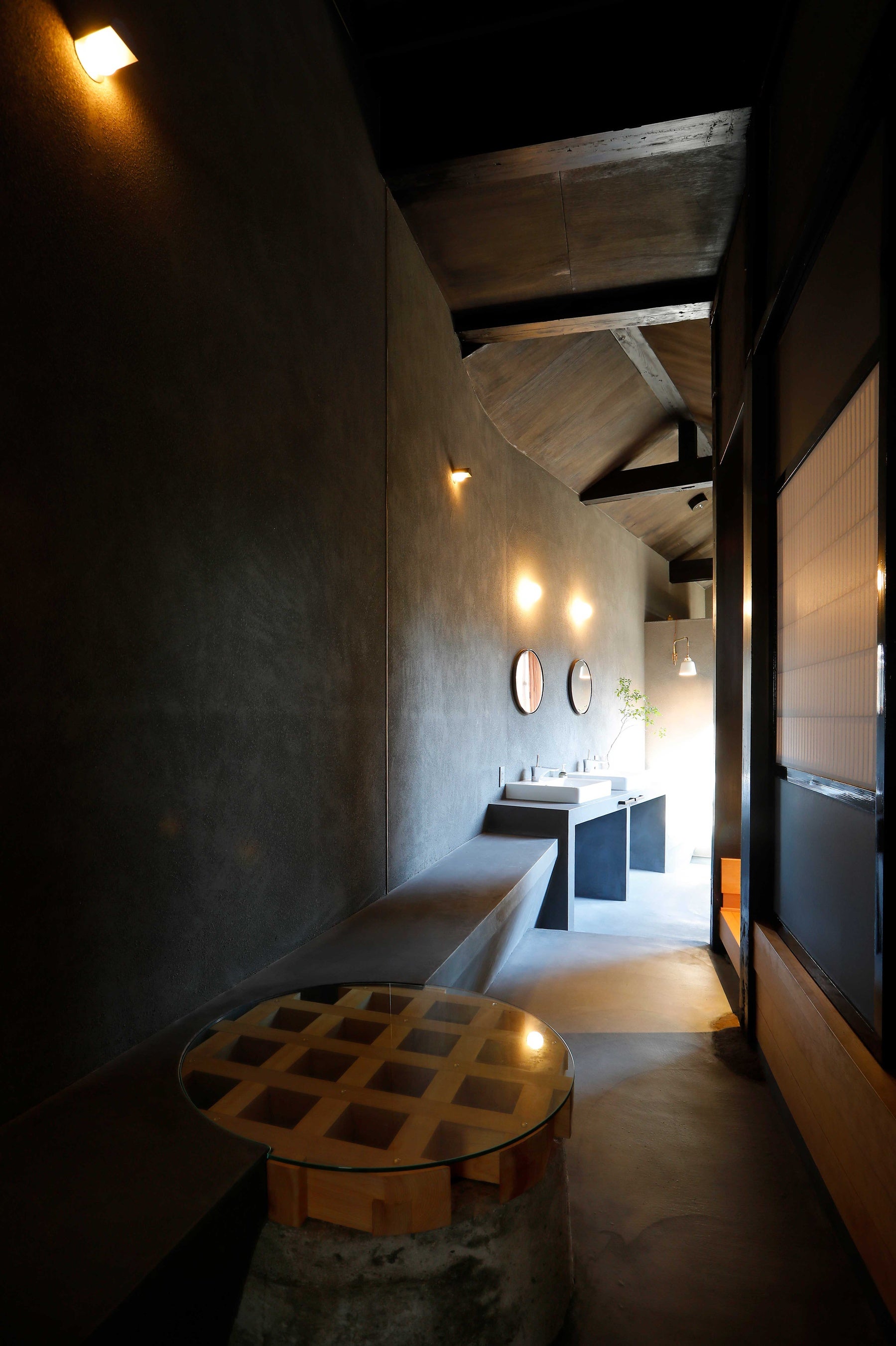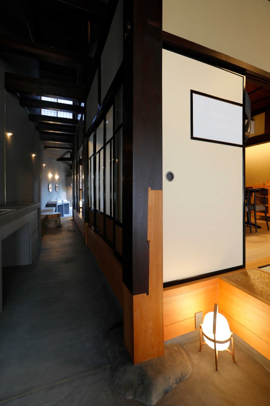 今回のプロジェクトでは、二軒のうち一軒を宿として再生。もう一軒はカフェとして改修し、多くの⼈に利⽤してもらえるよう計画。築90年を超える建物のため、再生はたやすいことではなかったと想像できるが、宿泊施設として使用するには十分な快適性が必要となるため、古民家としての意匠の再生と断熱性の向上をいかに両立させるかが大変だったと振り返る。たとえば、すでにリフォームでサッシ戸に変わっていた玄関や窓については、建築当時の意匠・材質を調べてオリジナルで建具を製作し復元するが、断熱性が損なわれるため、意匠に配慮しながら高断熱の内窓や真空ガラスで補うといった具合いだ。