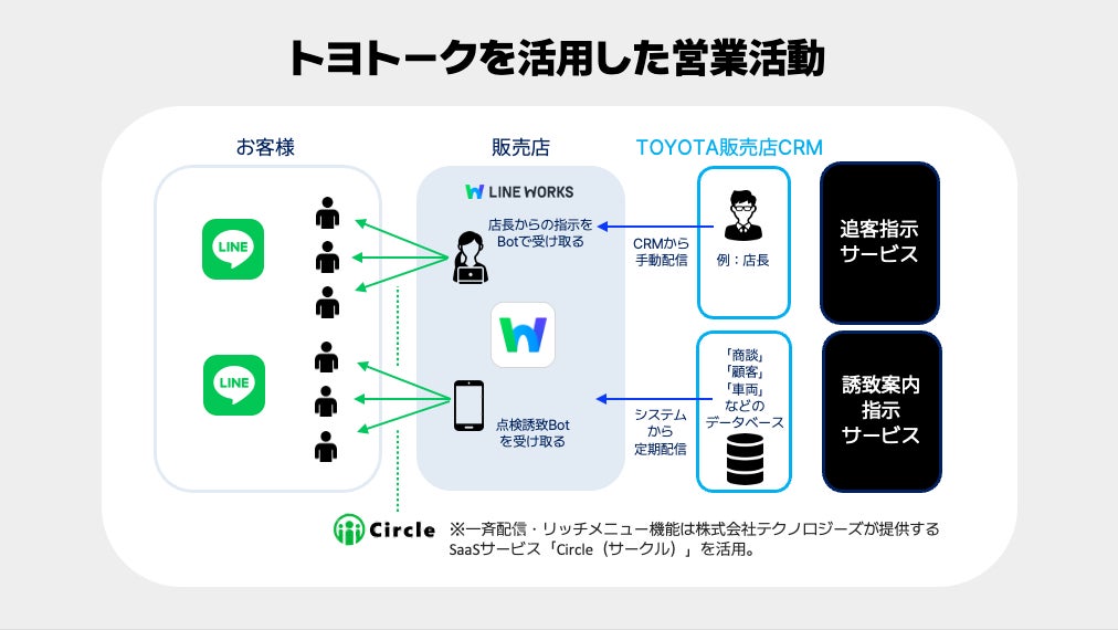 自動車ディーラー向けのデジタル営業支援ソリューション「トヨトーク」は、管理コンソールから販売員に向けて自動で追客指示を出し、その指示を販売員が「LINE WORKS」上で受け取り、ワンタップ(1ステップ)のUXにより販売員の「LINE WORKS」とつながった顧客のLINEに配信を行うことが可能です。LINE WORKS株式会社とオーティー情報システム株式会社が共同で販売を行っており、一斉配信・リッチメニュー機能は株式会社テクノロジーズが提供するSaaSサービス「Circle(サークル)」を利用しています。