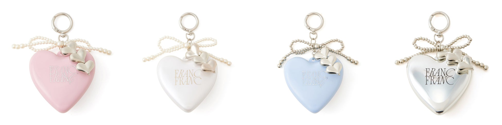 キャッチーなハートモチーフがかわいいチャーム付きのミラー&ブラシです。甘くなりすぎないよう、トレンド感のあるロゴやチャームをあしらい、大人かわいい雰囲気に仕上げました。定番で使いやすいホワイト、ピンクのほか、トレンドカラーのシルバーとライトブルーを採用したお揃いで持ちたくなる4色展開です。カラビナ付きでチャームとしてバッグに付けられるだけでなく、開くとミラーとブラシがセットされているので、外出先でメイク直しやヘアセットに便利です。