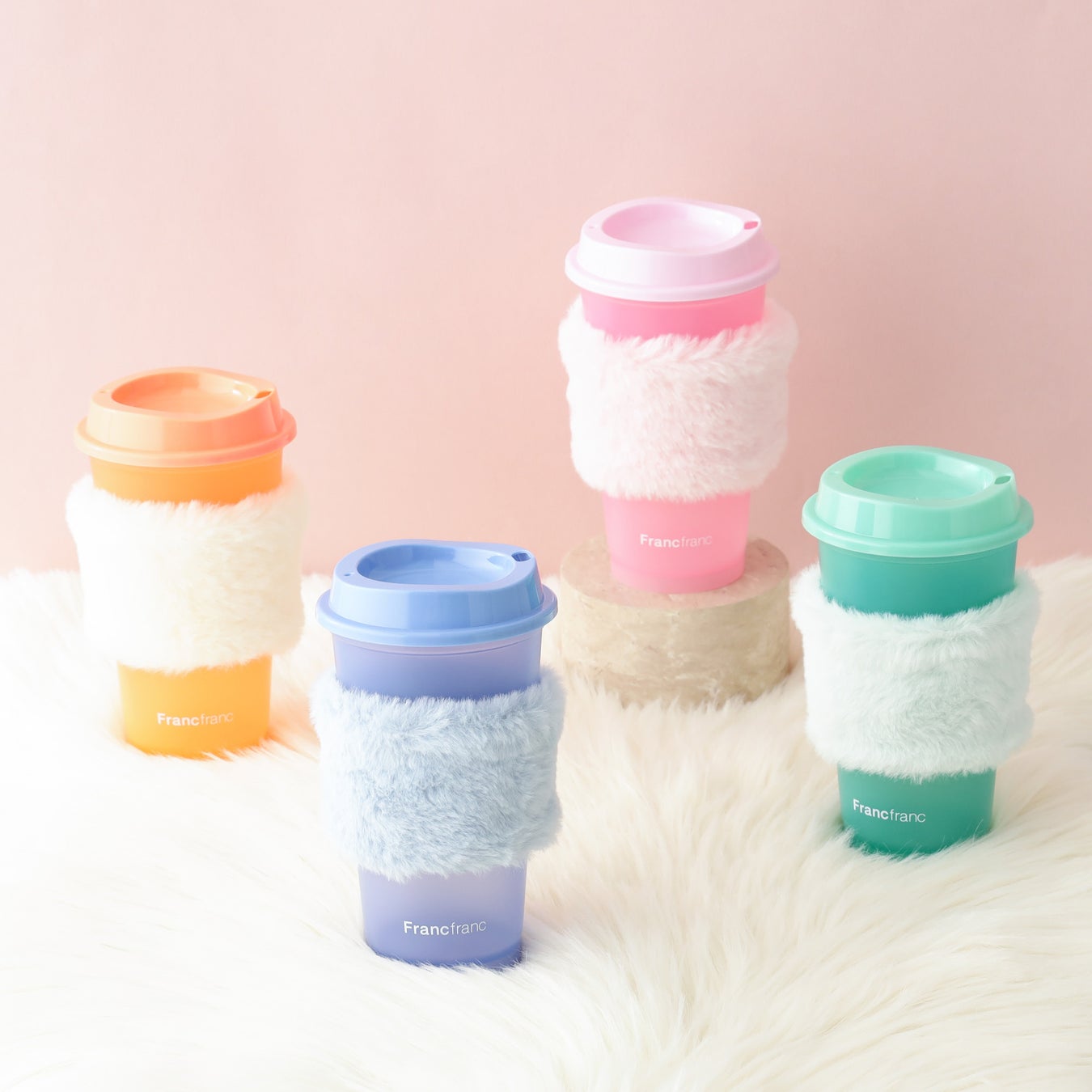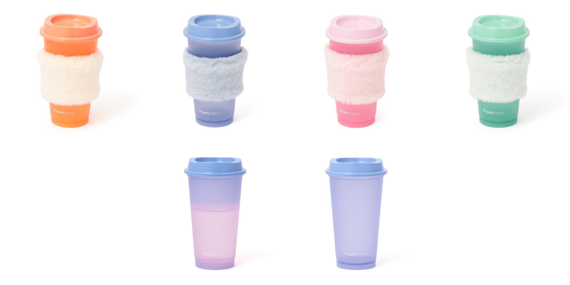 人気の「カラーチェンジタンブラー」にホットドリンク対応の新タイプが登場しました。約45℃以上の温かいドリンクを注ぐと本体の色が変化し、フォトジェニックな仕掛けを楽しめます。容量は440mlと日常使いにちょうど良いサイズ感です。冬らしいもこもこのファーを使用したスリーブ付きなので、熱さを気にせず快適に持つことができます。