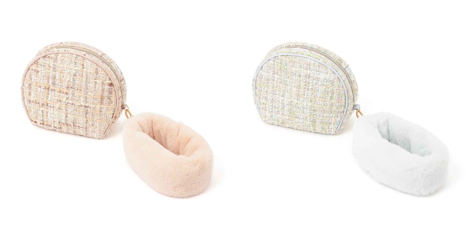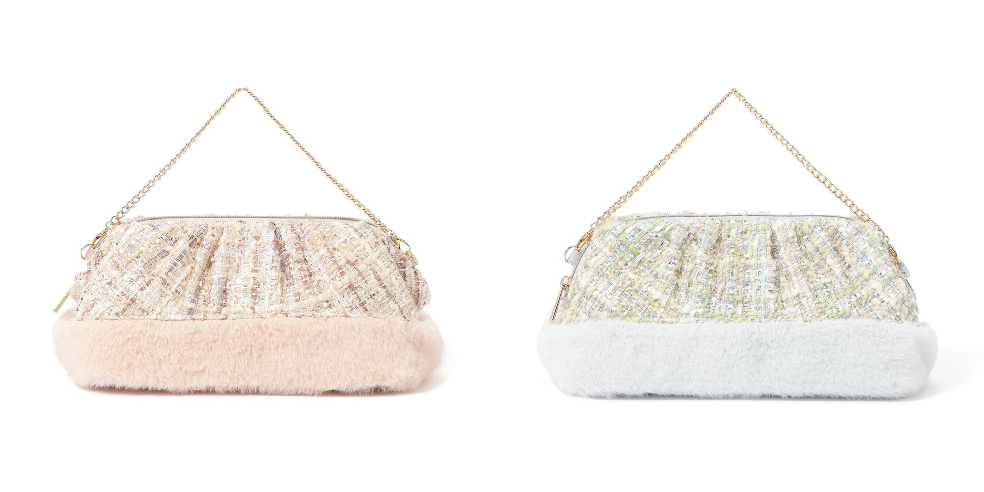 あたたかみのあるツイードにふわふわのファーを組み合わせた、ホリデー気分を盛り上げるポーチです。ニュアンスカラーのツイードが温かみを演出し、ファーとの切替が華やかなアクセントに。ポーチには取り外し可能なファーハンドル付き、ワイヤーポーチはチェーンハンドル付きで、ちょっとしたお出かけのパーティーバッグとしても活躍します。