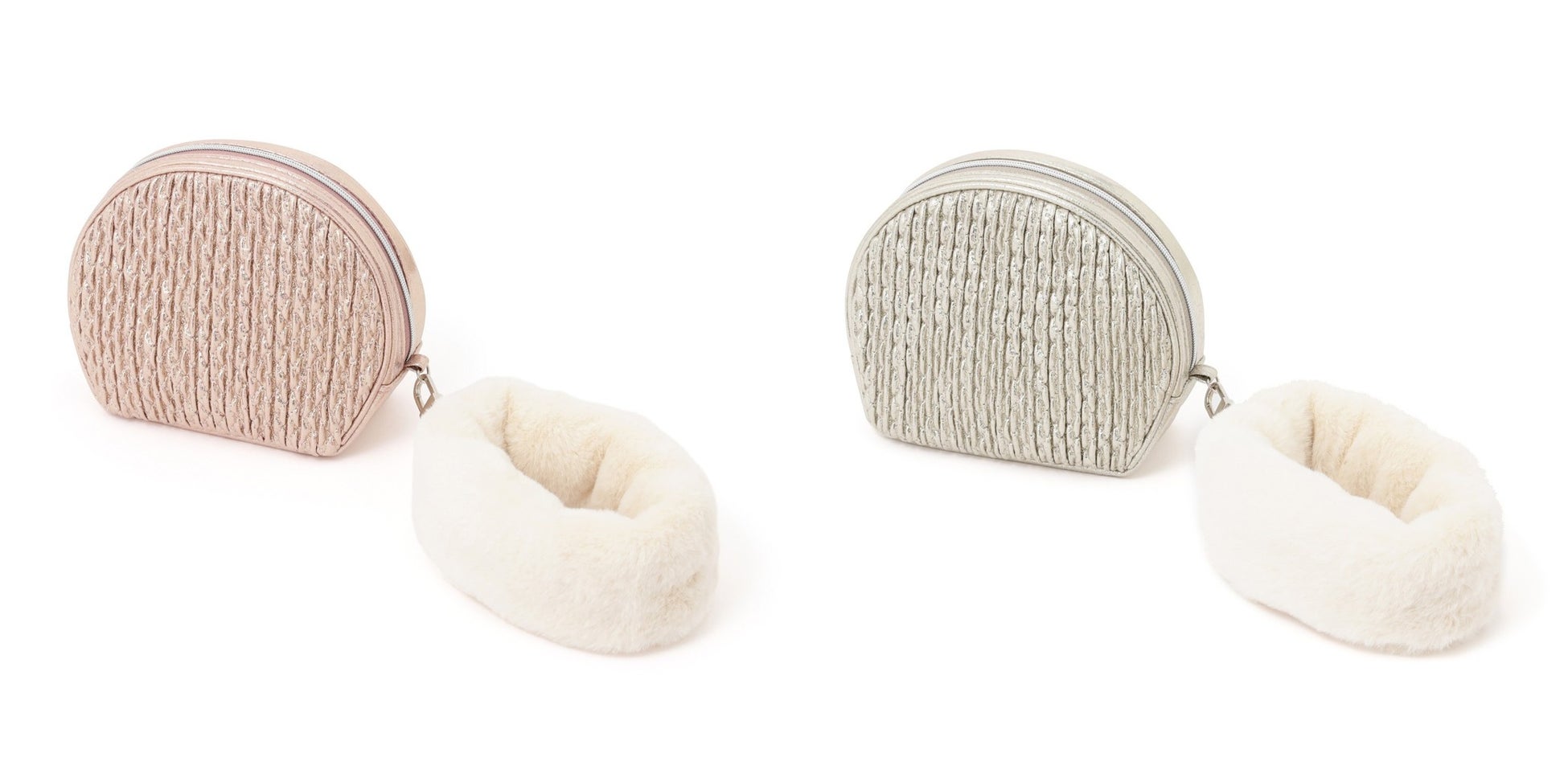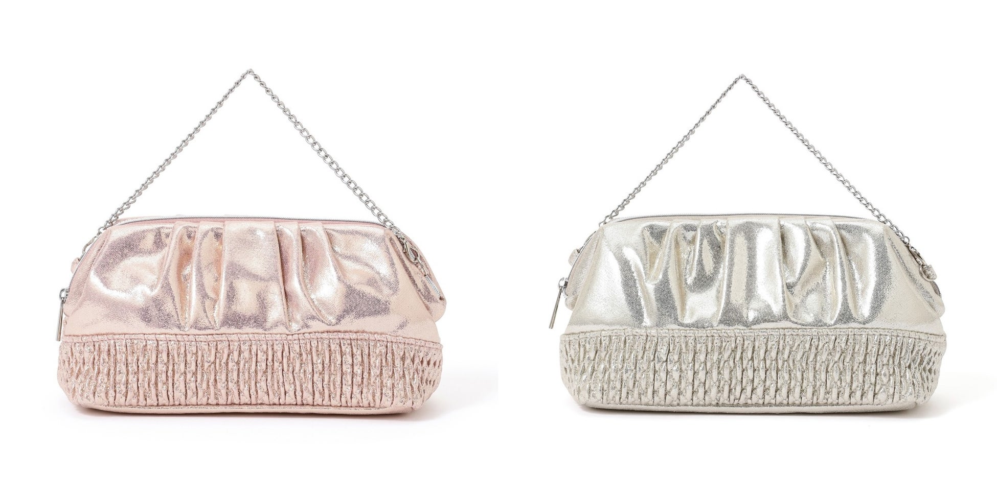 ホリデーシーズンのお出かけにぴったりなキラキラとした素材感が魅力のポーチです。合皮素材にくしゅくしゅとした圧縮加工を施し、立体感と輝きをプラスしました。ポーチには取り外し可能なファーハンドル付き、ワイヤーポーチはチェーンハンドル付きで、ちょっとしたお出かけのパーティーバッグとしても活躍します。