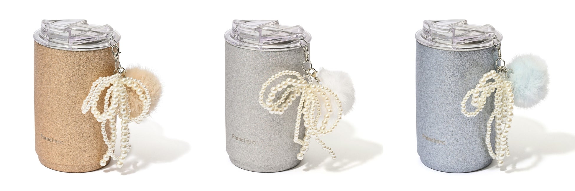 キラキラとしたラメが目を惹くチャーム付きのタンブラーです。アパレルトレンドの“チャームを楽しむ”感覚を取り入れた、遊び心あるデザインです。チャーム部分は取り外し可能なので、自分の好きなチャームにカスタマイズしてデコレーションを楽しめます。華やかなゴールド、トレンド感あふれるオーロラ調シルバー、冬らしいブルーの3色をご用意しました。ホリデーシーズンを華やかに演出するギフトとしてもおすすめです。