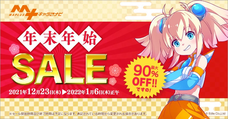 株式会社エディア(本社:東京都千代田区、代表取締役社長:賀島 義成、以下:エディア)は、当社が運営する徒歩・カーナビアプリ『MAPLUSキャラdeナビ』にて、「年末年始SALE」を2021年12月23日(木)から開催することをお知らせいたします。