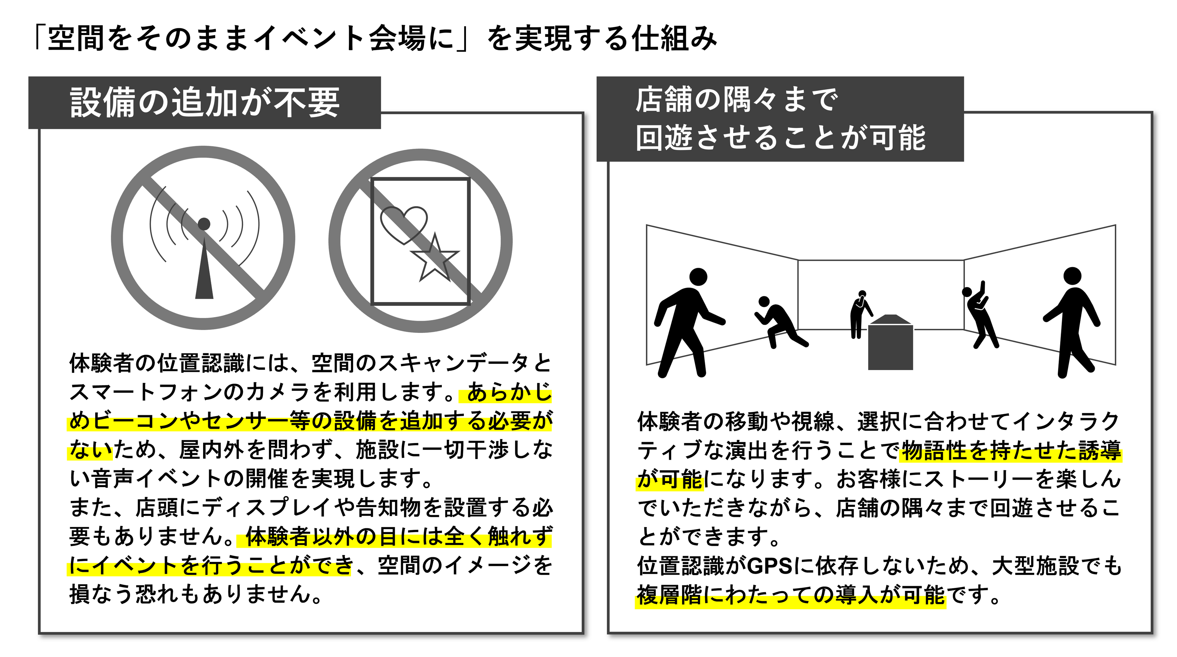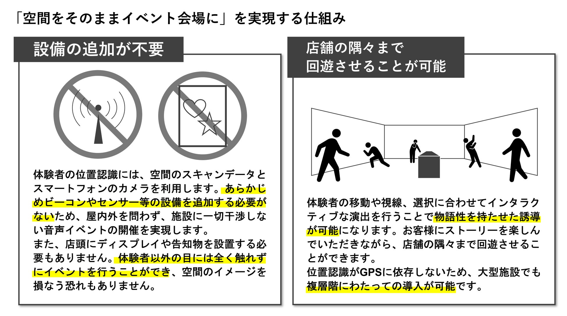 体験する人の位置認識には、空間のスキャンデータとスマートフォンのカメラを利用するだけで、ビーコンなどの設備を追加する必要はありません。また、体験者の移動や視線、選択に合わせてインタラクティブな演出を行えるので、物語を聴いてもらいながら、体験者をその空間の隅々まで誘導することが可能です。