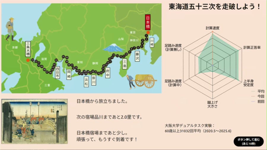 測定を実施する度に東海道五十三次を進んでいくような流れが組み込まれていて、繰り返し測定したくなる楽しみを加えています。また、体験履歴のグラフ化により、認知・身体機能の日常的変化を感じることができます。