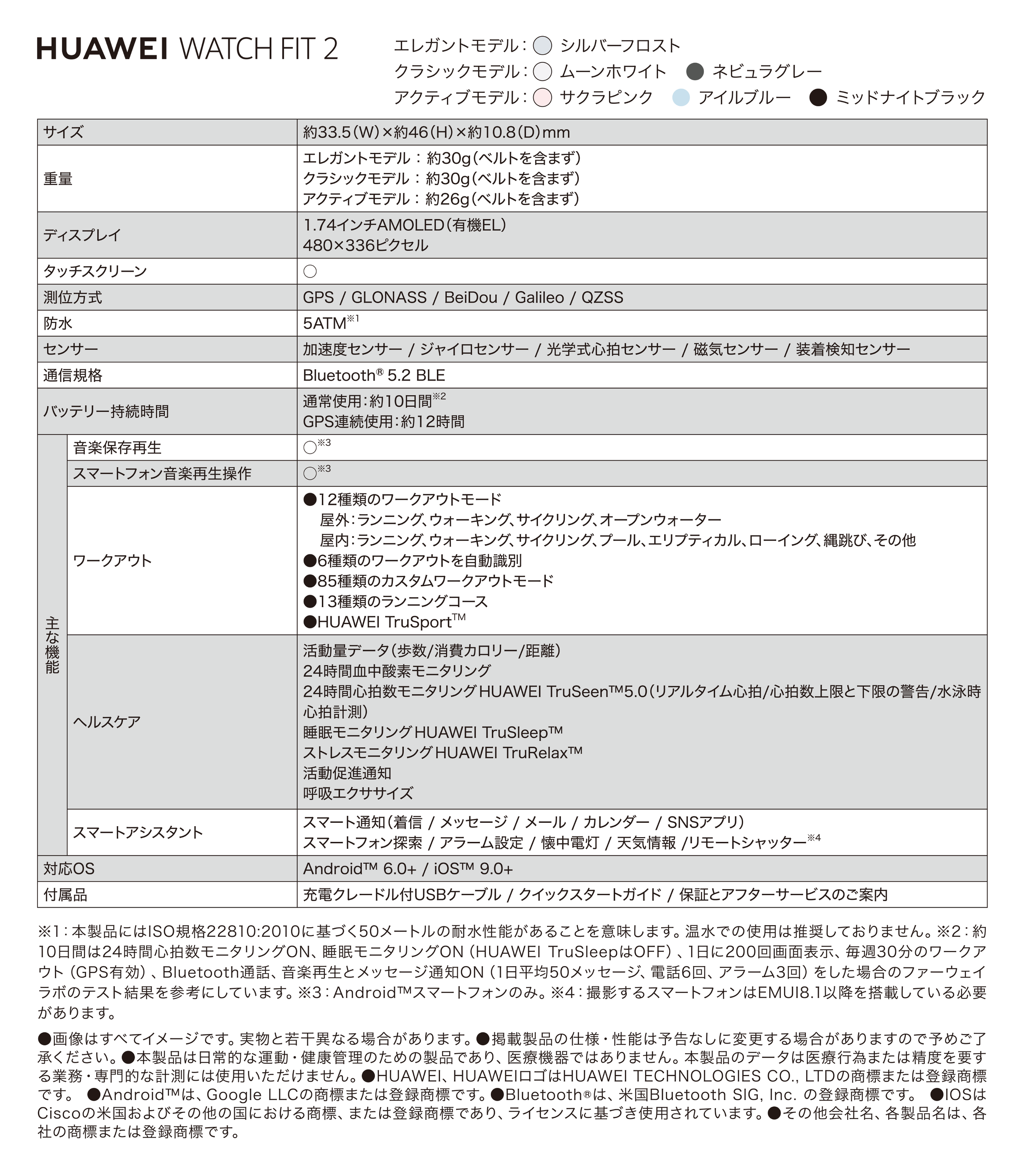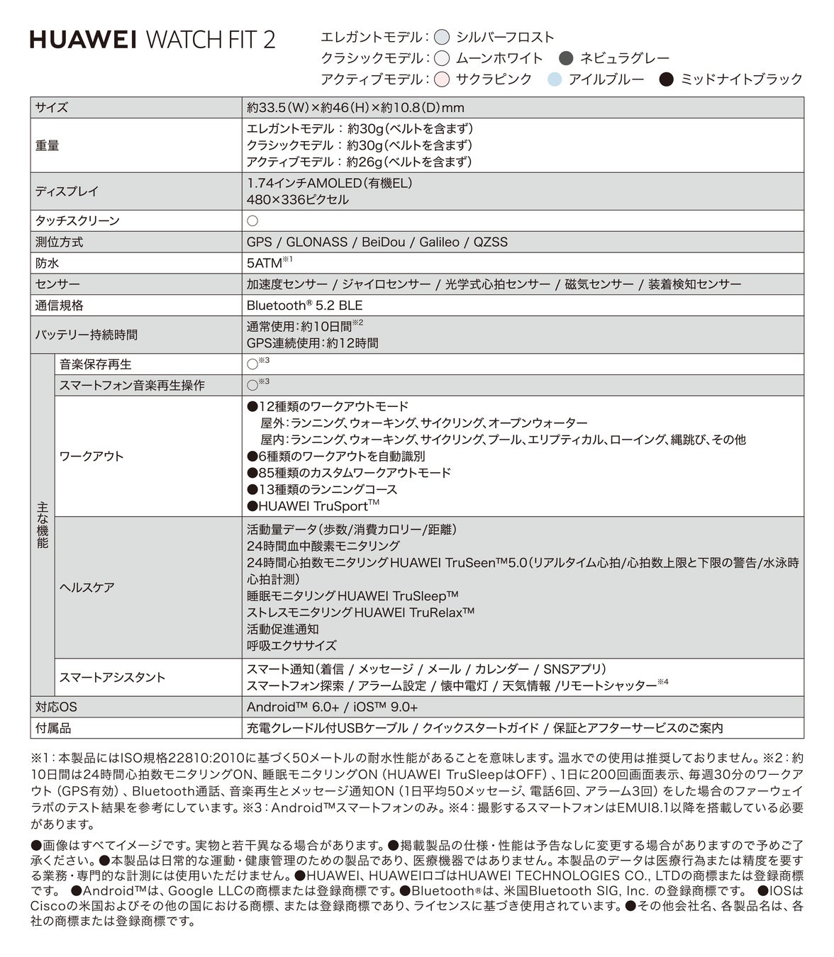 『HUAWEI WATCH FIT 2』の主な仕様