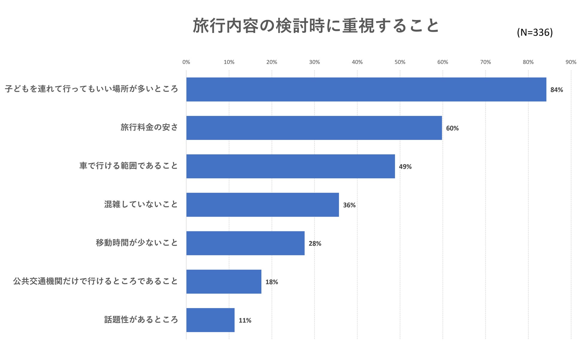 「子どもを連れて行ってもいい場所が多いところ」という回答が非常に多く、84%でした。家族旅行においては、やはり、「子どもとの行きやすさ」や「子どもが楽しめる場所」などが重視されています。