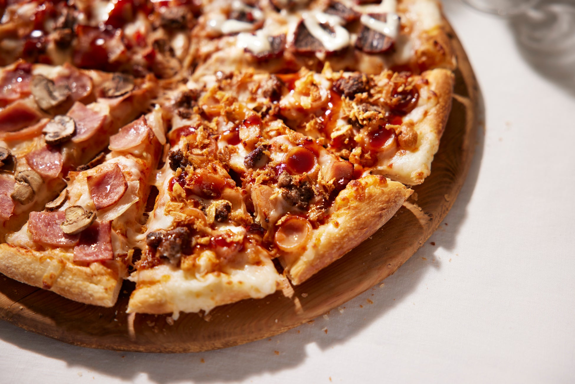ローストチキン、ビーフ100%パティ、粗挽きソーセージを贅沢に使用。そこに、カリッと揚げたフライドオニオンと、ドミノ・ピザ特製のスモーキーBBQソースをトッピングしたこだわりの1枚です。肉の旨味と香ばしいオニオンの食感が楽しい、ボリューム満点のピザです。