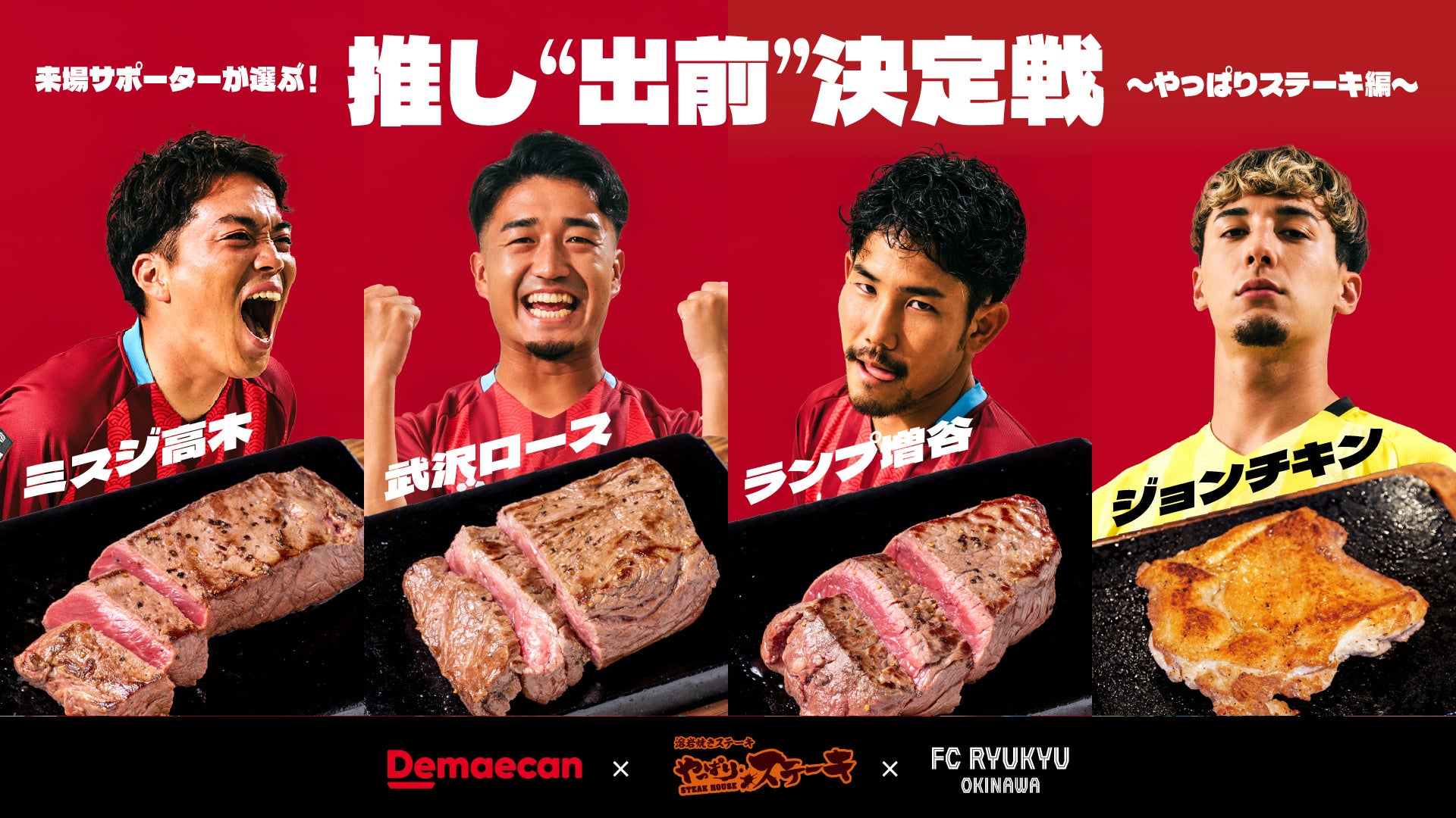 FC琉球×やっぱりステーキ×出前館の3社が、初めてのコラボ企画を実施!冠試合「出前館スペシャルデー」の当日限定で、出前館ブースに設置される選手×ステーキのポスターの中から、あなたの“推し”にシールを貼って投票してください。1番人気だったステーキは、期間限定で出前館だけの特別価格でご提供いたします。