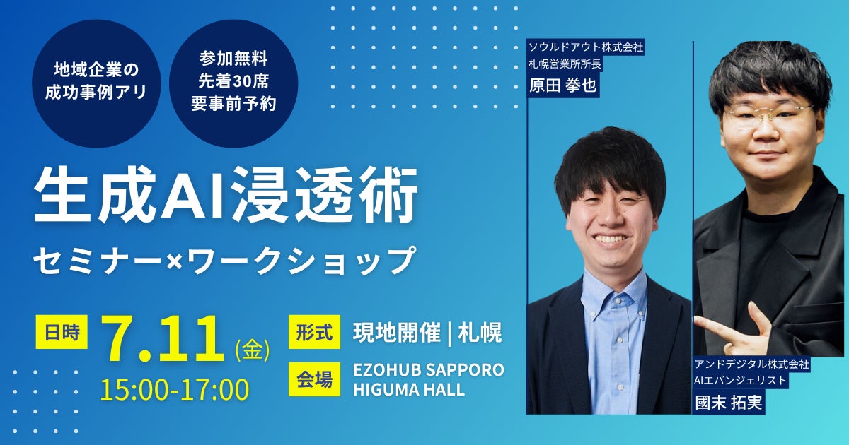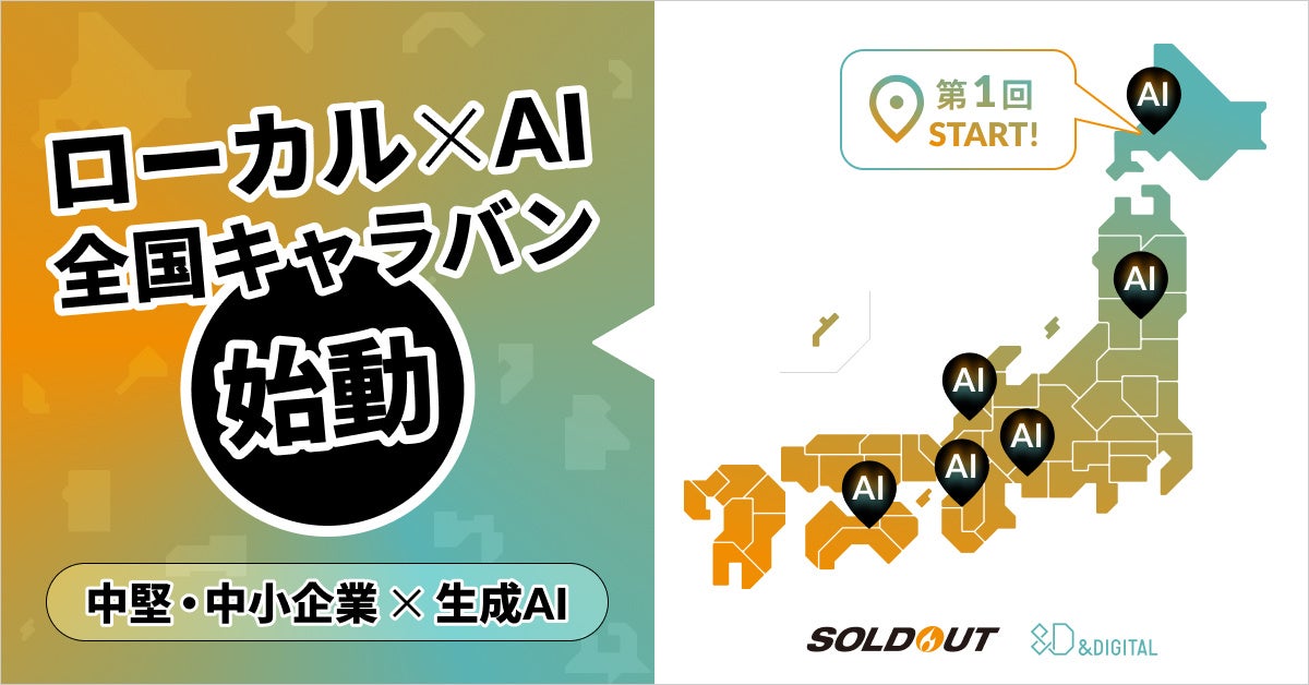 地方を含む全国の志ある中堅・中小企業の成長支援をデジタルマーケティング領域で展開するソウルドアウト株式会社(本社:東京都文京区 代表取締役社長CEO兼CCO:荒波 修)の連結子会社であるアンドデジタル株式会社(本社:東京都文京区 代表取締役:津田 翔平、以下「アンドデジタル」)は、ソウルドアウトとともに、同グループの掲げる「ローカル&AIファースト」構想に基づき、地域企業の生成AIの活用と定着を後押しするため、「ローカル×AI 中堅・中小企業のための生成AIセミナー全国キャラバン」を開始します。