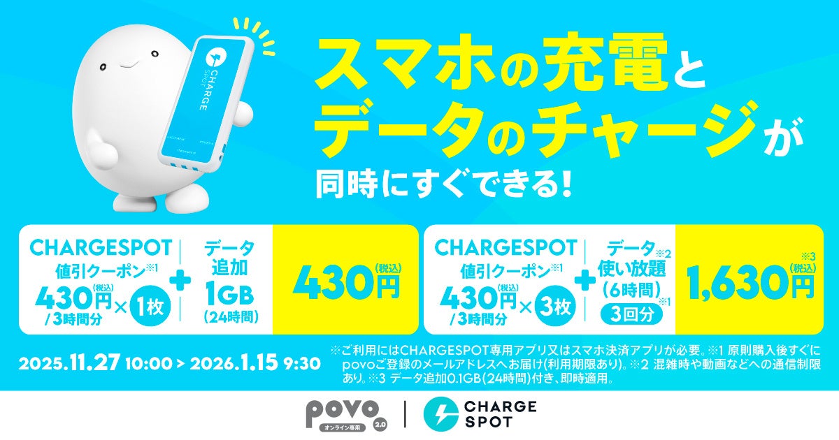 モバイルバッテリーシェアリングサービス「CHARGESPOT™(チャージスポット)」を運営する株式会社INFORICH(本社:東京都渋谷区、代表取締役 Group CEO:秋山 広宣、以下「INFORICH」)は、KDDI株式会社および沖縄セルラー電話株式会社と共同で、携帯料金プラン「povo2.0」において、「CHARGESPOT 値引きクーポン(430円/3時間分)」とデータトッピングを組み合わせたおトクなセットを2025年11月27日(木)から2026年1月15日(木)まで提供します。