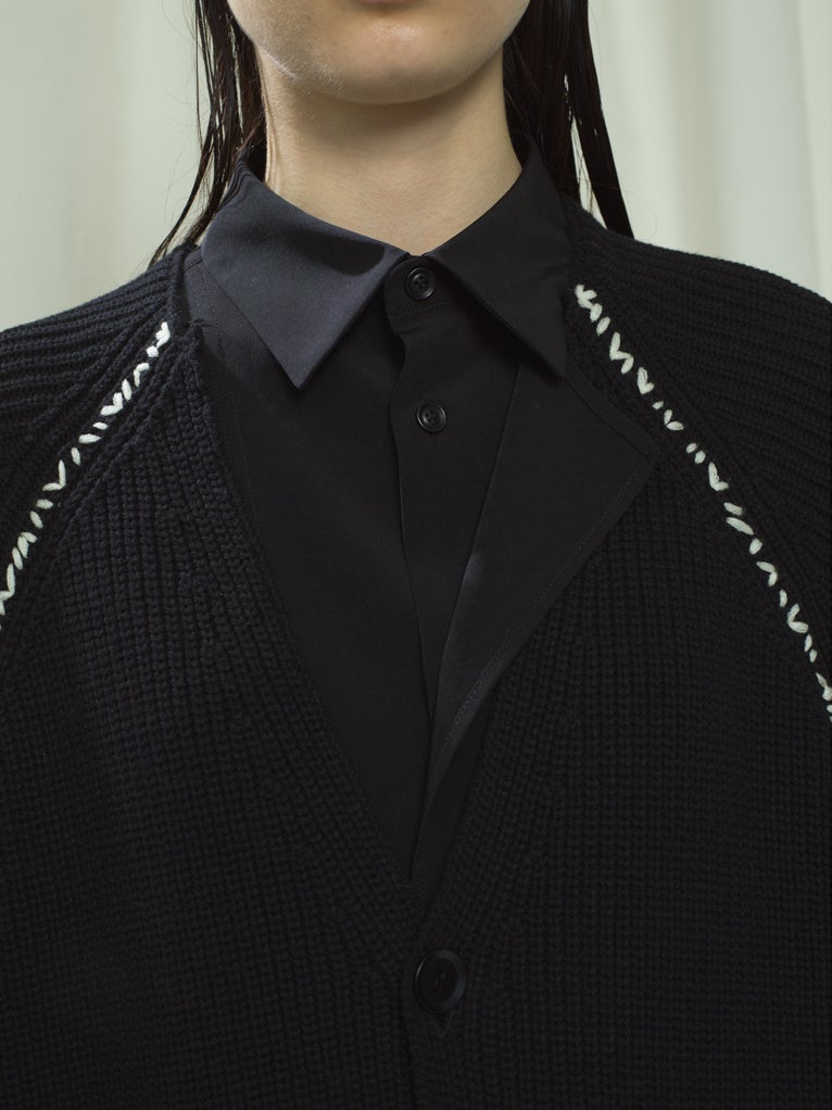 しつけ留めのように不規則なピッチで入るステッチのラインが、パーツをパッチワークのようにつなぎ合わせ、手編みのニュアンスと機械的で無機質な質感のバランスが個性を包む。