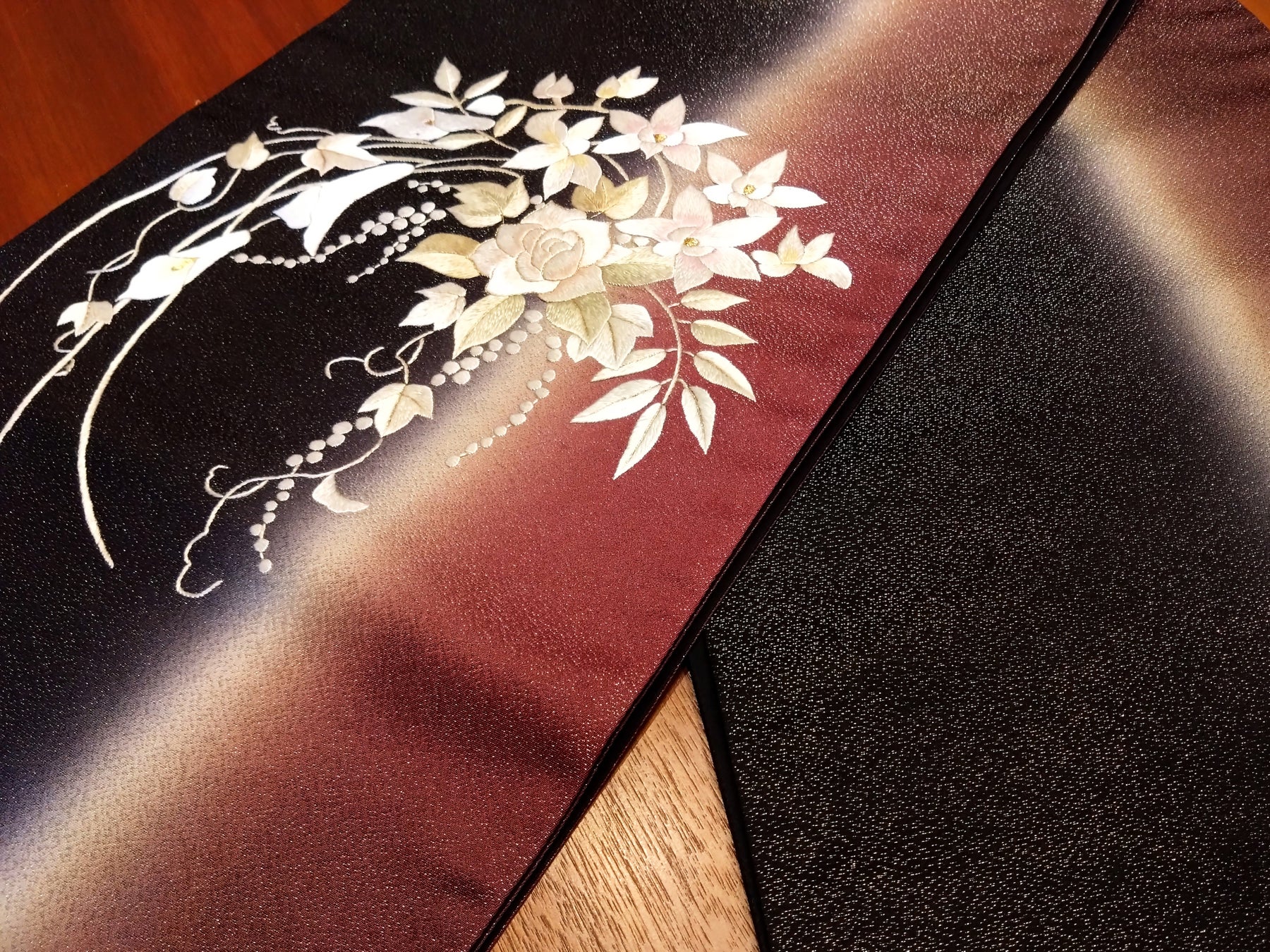 特徴:丹後ちりめんを使用し、職人による引き染めで染色。華紋が濃い地色に映える、華やかで格式のあるデザイン。