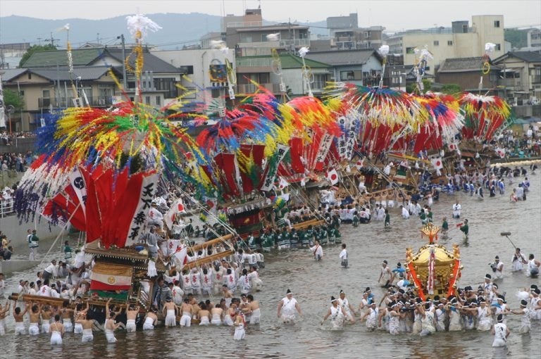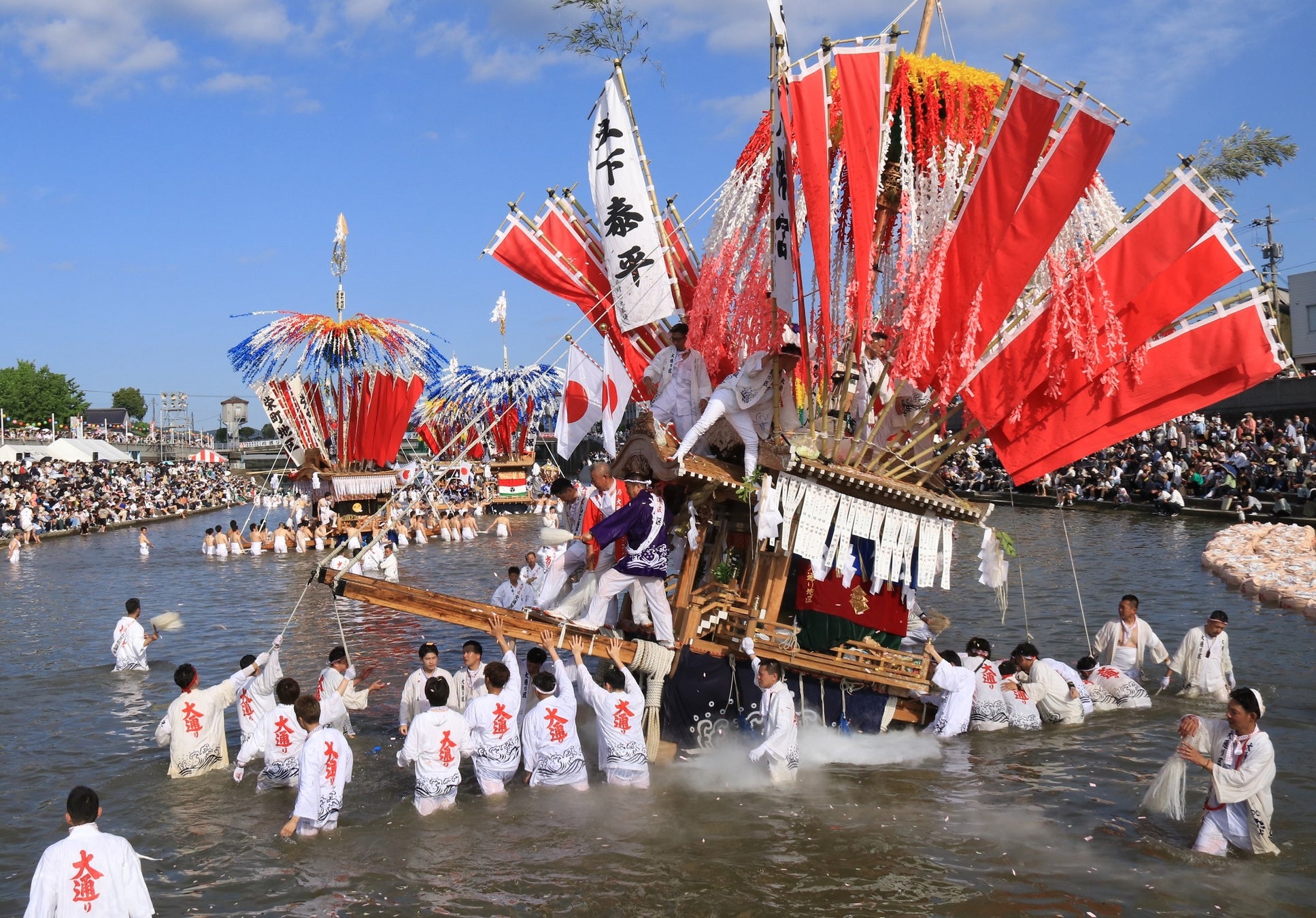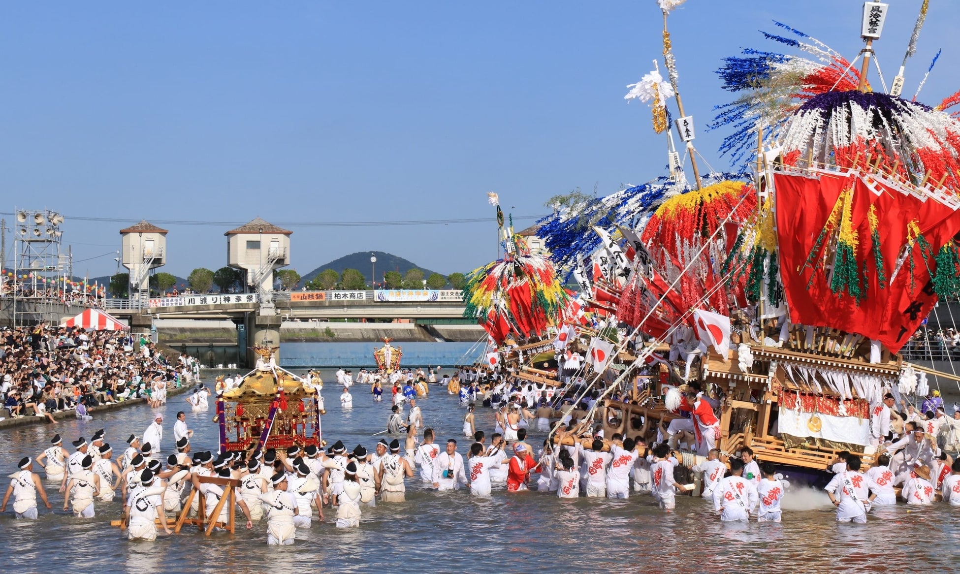 ツアーでは、祭りのハイライトである「川渡り競演会」で10基を超える大きな山笠を上下に揺らしながら川を渡っていく勇壮な祭りの様子を桟敷席から観覧していただけます。