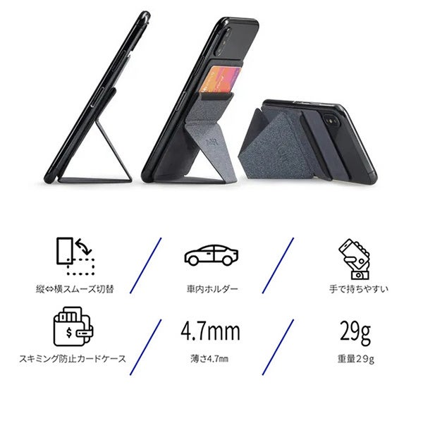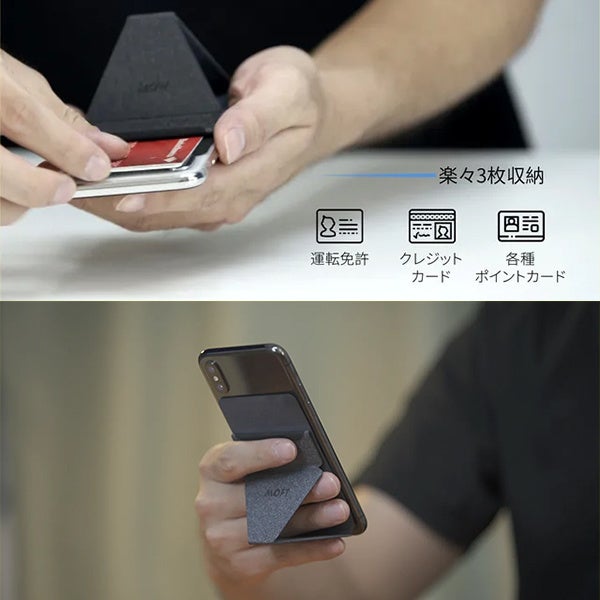 MOFT Xはカードを収納できるスキミング防止カードケース付きです。運転免許、クレジットカード、交通系ICカードなど最大3枚まで収納できます。さらにスキミング磁気防止仕様で、カードを安全に守ります。