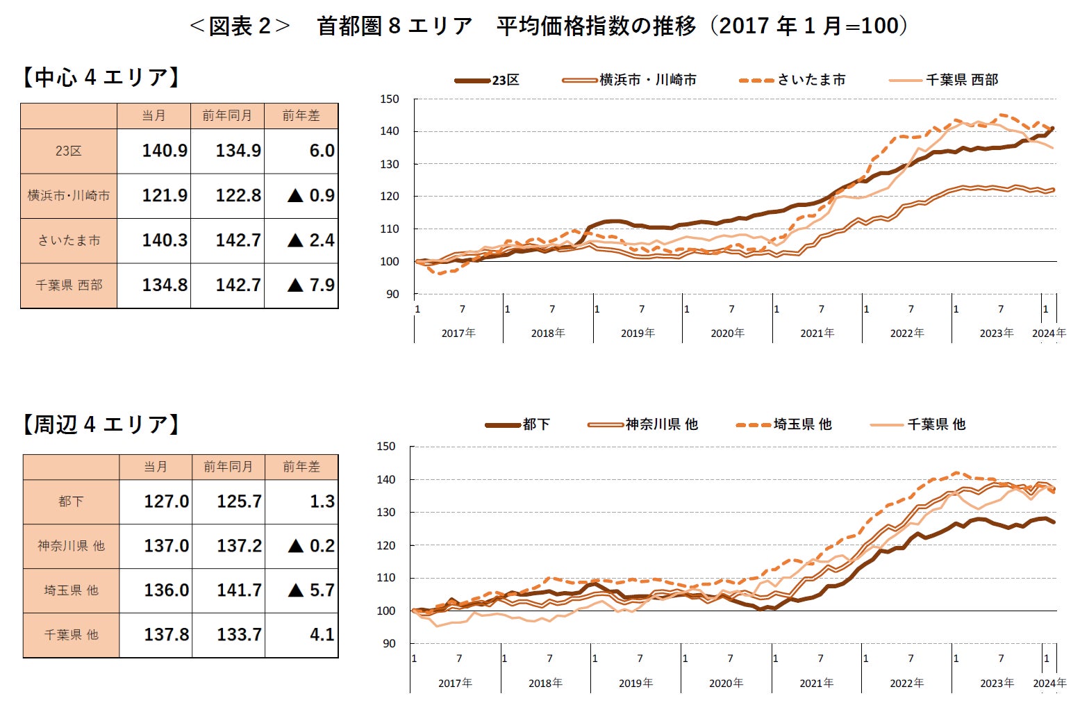 エリア別では、8カ月連続下落の千葉県西部をはじめ5エリアが前月比下落した一方で、東京23区、千葉県他は2017年1月以降最高額となっており、エリアによる価格動向の違いが見られた。