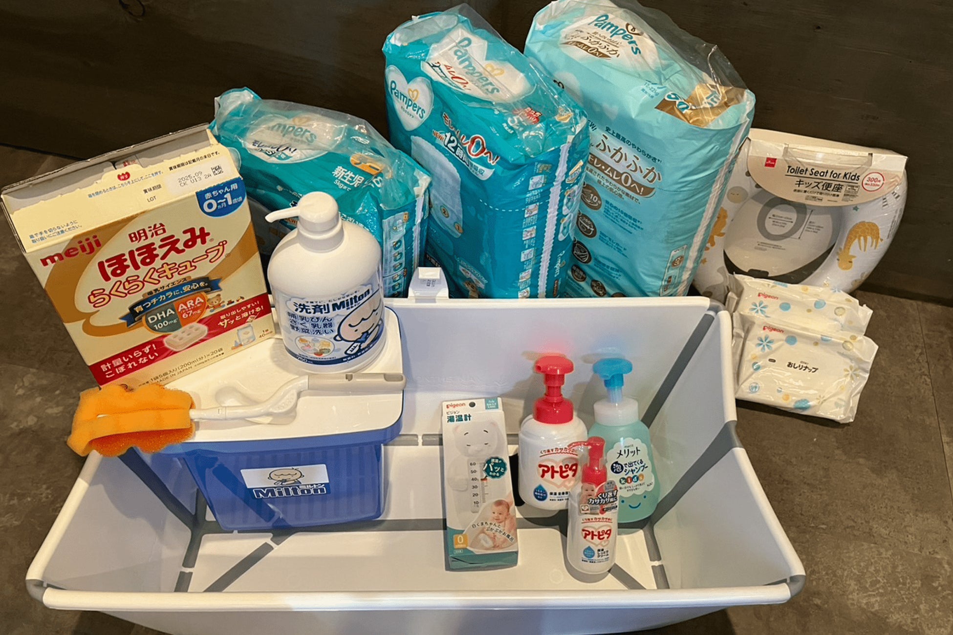 赤ちゃんカトラリー、ベッドガード、ベビー便座、おむつバケツ、紙エプロン、ミルトンケース、錠剤、洗剤、ベビーバス、食事用ベビー椅子、ベビーベッド、 シャンプー、泡全身ソープ、ボディークリーム、歯ブラシ |