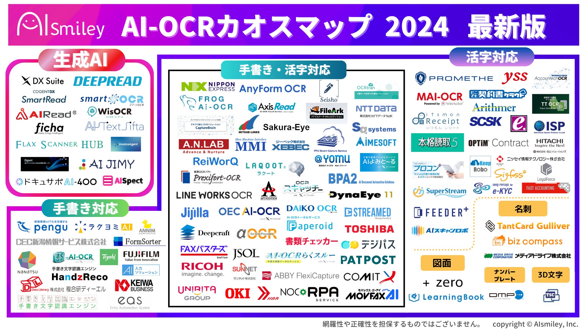 AIポータルメディア「AIsmiley」を運営する株式会社アイスマイリー(東京都渋谷区、代表取締役:板羽晃司)は、書類や帳票の読み取りで活用できるAI-OCR製品をまとめた「AI-OCRカオスマップ2024」を、2024年11月7日に公開しました。掲載製品は合計110サービスです。