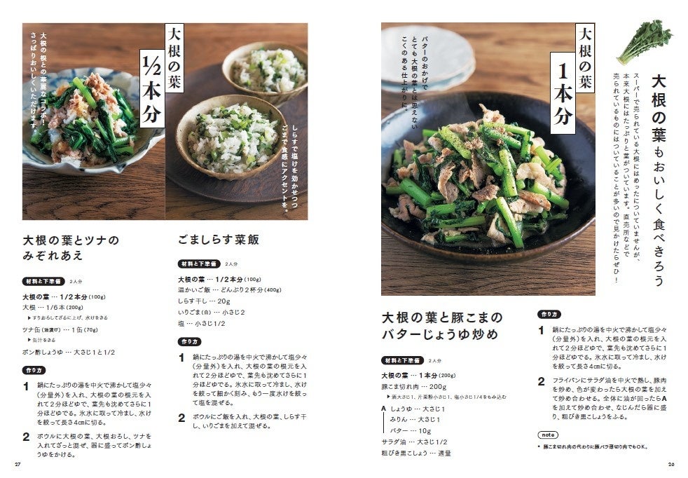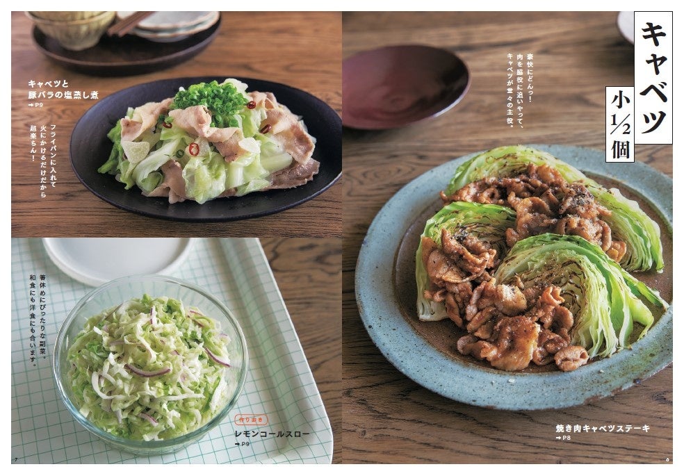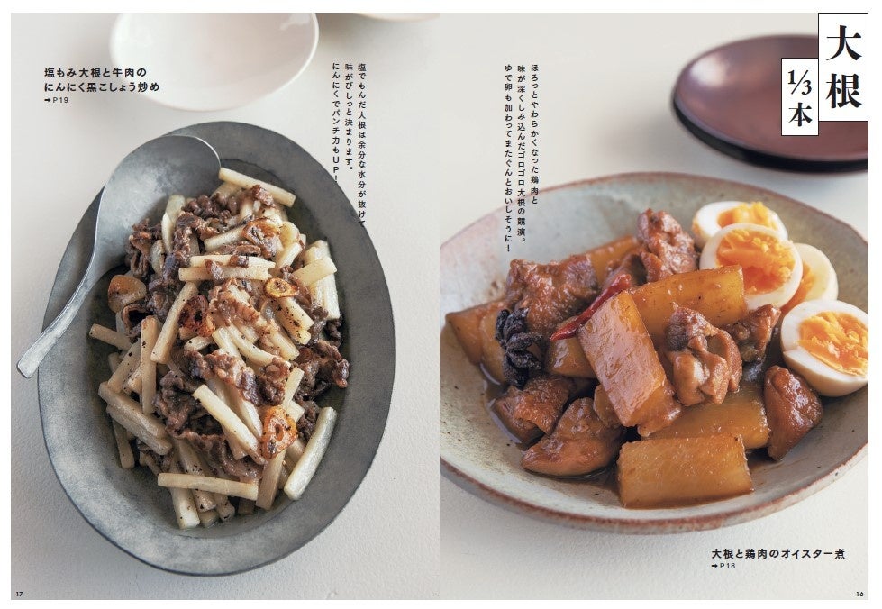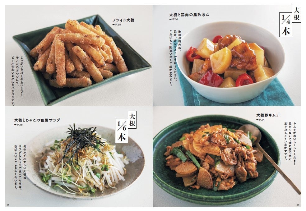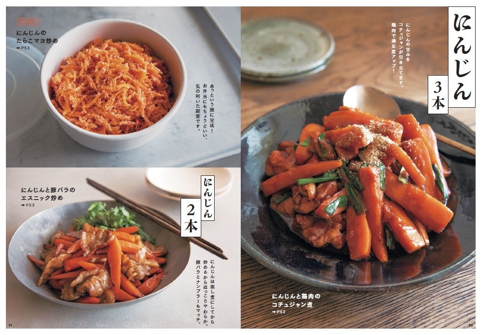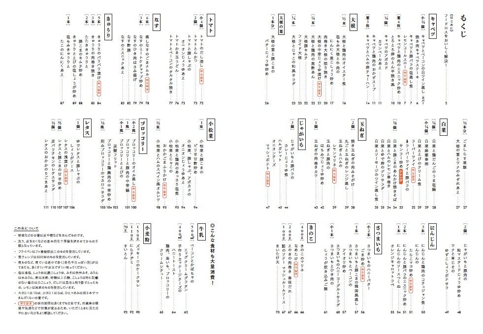 本書には、野菜を中心に、16の食材の、90レシピを収録しています。これらの食材は、「大量消費」が必要なくらい、日常的によく使う食材ということ。ふだん使いのレシピ集として、毎日のおかずにや作りおきにも大活躍の一冊です。