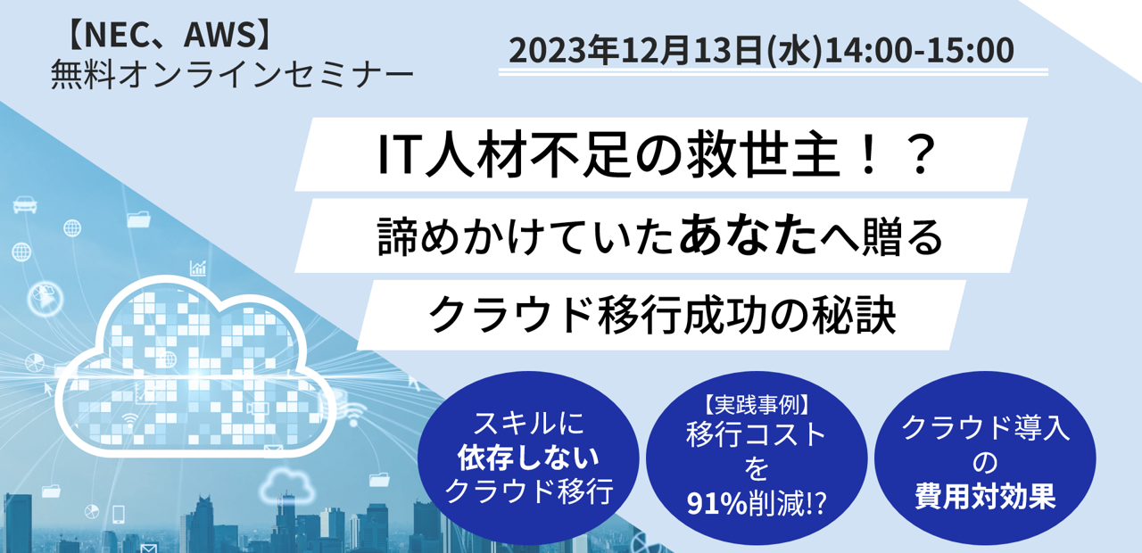 NEC、無料Webセミナー 「IT人材不足の救世主!?諦めかけていたあなたへ贈るクラウド移行成功の秘訣」12/13開催